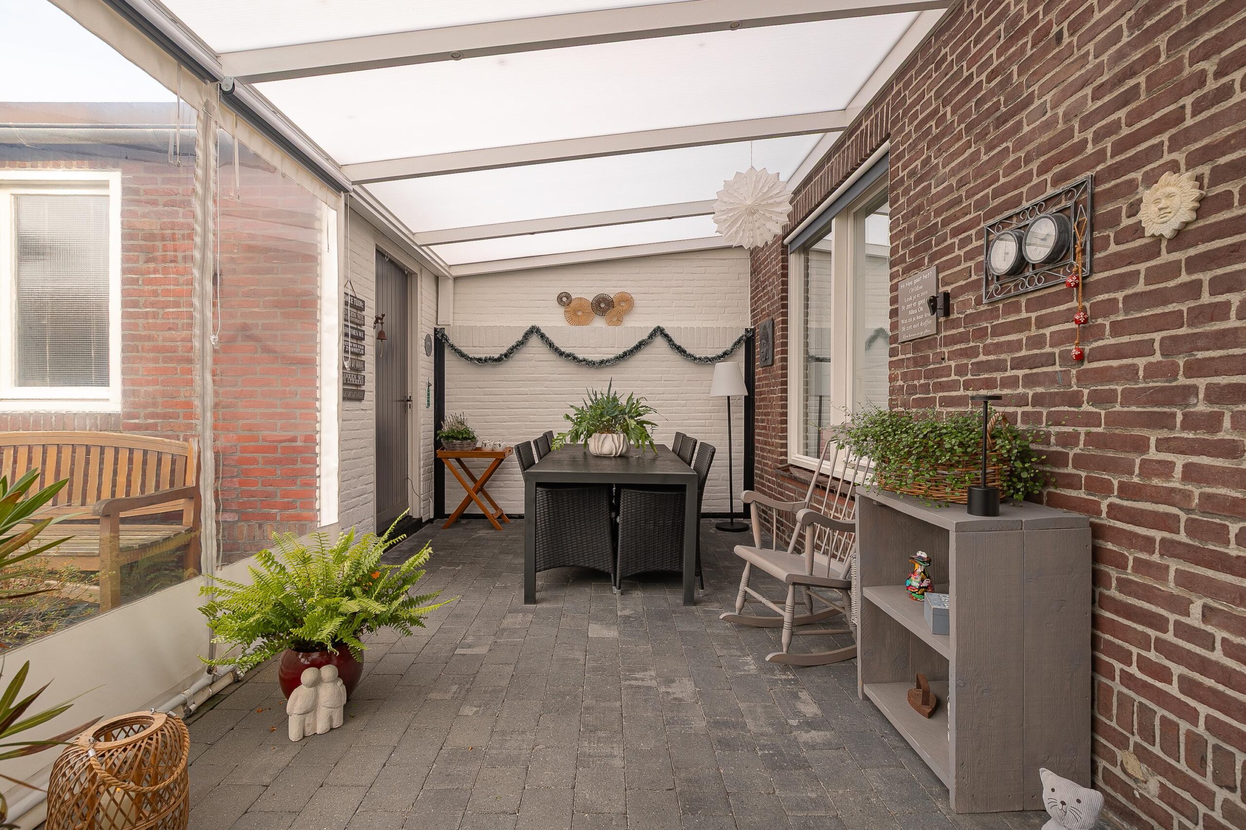 Vanuit de keuken toegang naar het overdekt terras. Het terras is overdekt middels een aluminium overkapping met polycarbonaatplaten inclusief verlichting. Hierdoor is de buitenberging ‘droog’ te bereiken. Er zijn twee buitenbergingen met een gezamenlijk oppervlak van 14m2 groot. Rondom de overkapping zijn winddoeken en een rolluik geplaatst waardoor de ruimte kan worden afgesloten.