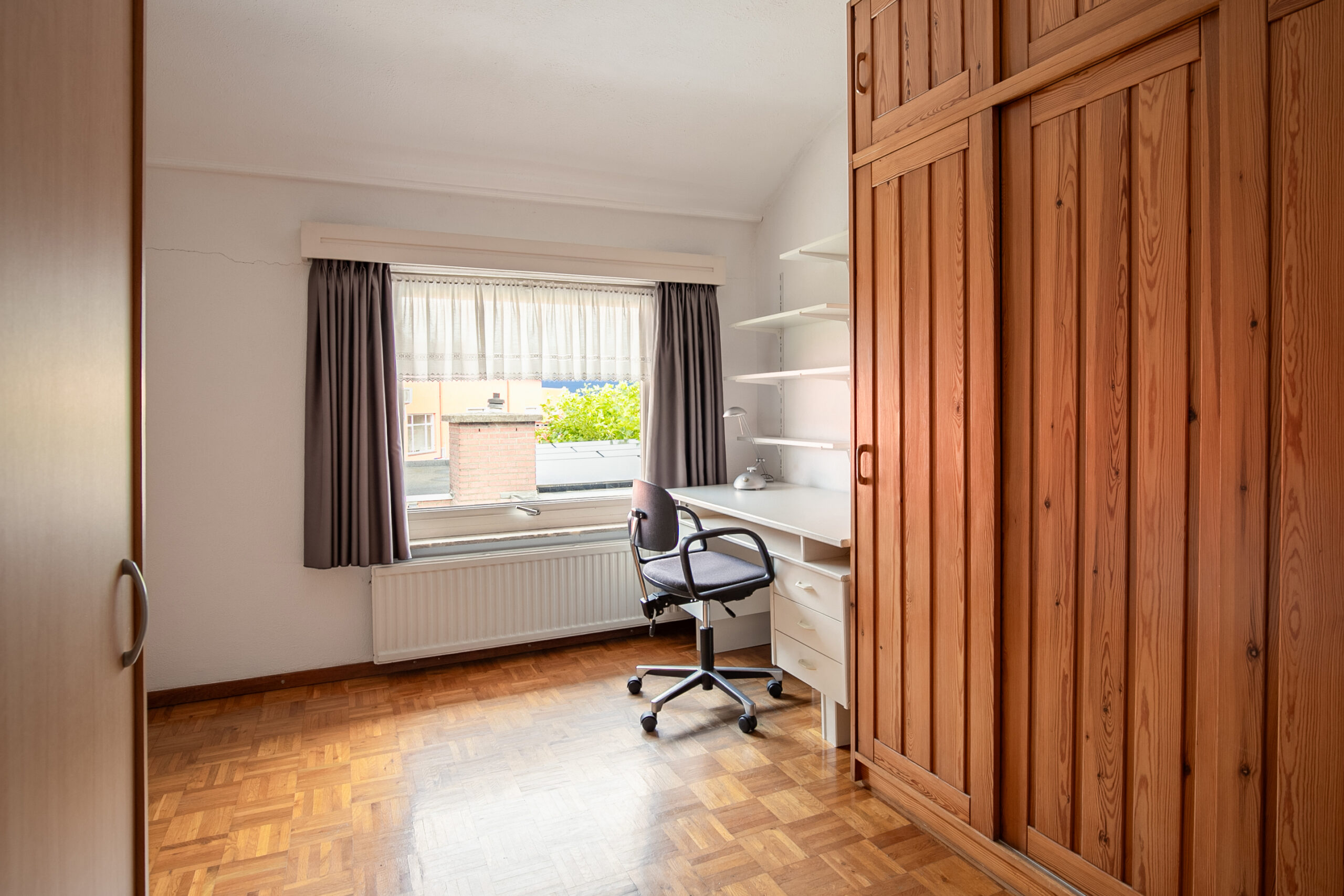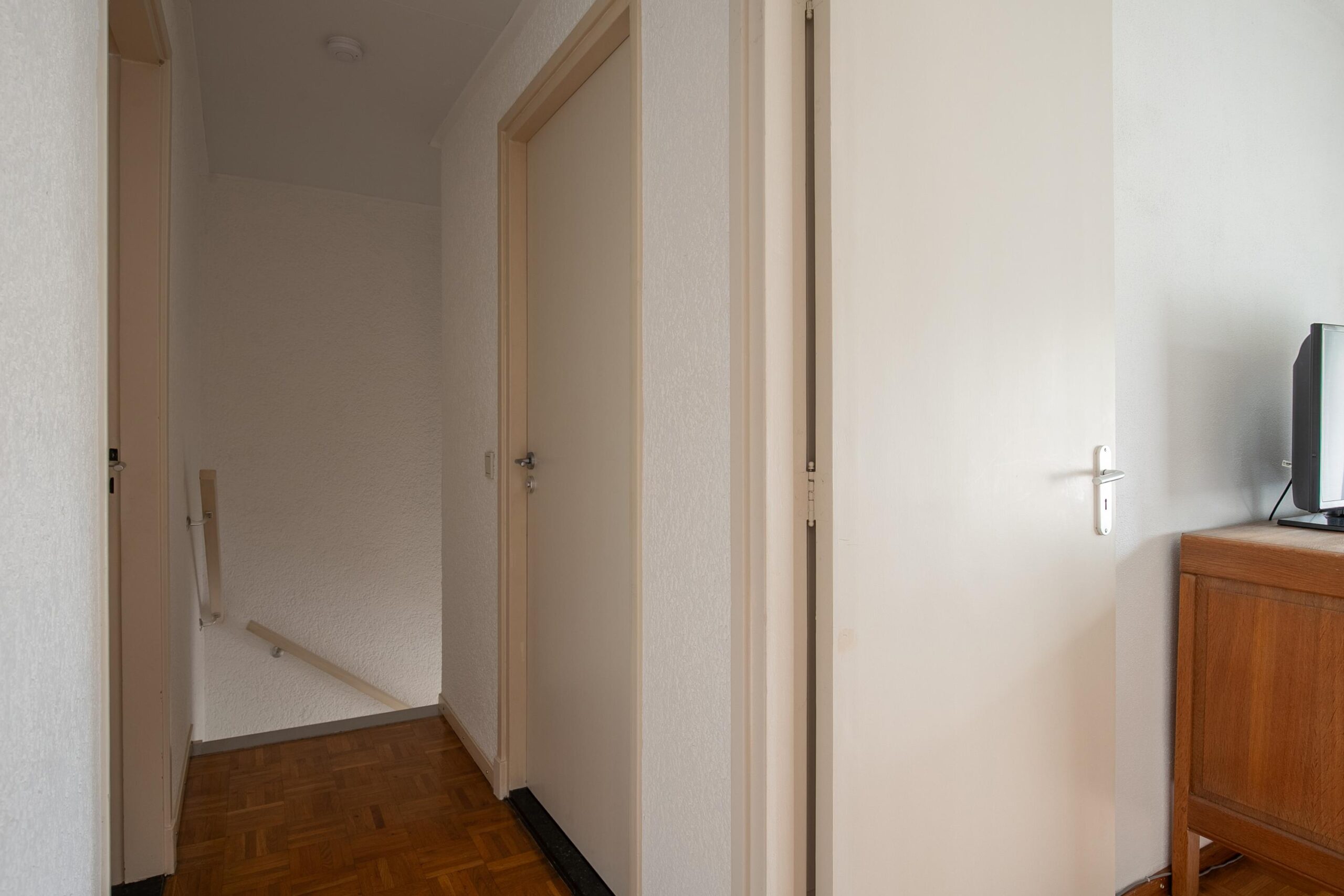 Via de trap in de hal bereiken we de eerste verdieping. Hier bevinden zich drie slaapkamers en de badkamer. De slaapkamers zijn van goed tot ruim formaat, aangenaam licht en keurig afgewerkt met een blokjes parketvloer en een neutrale afwerking op de wanden.