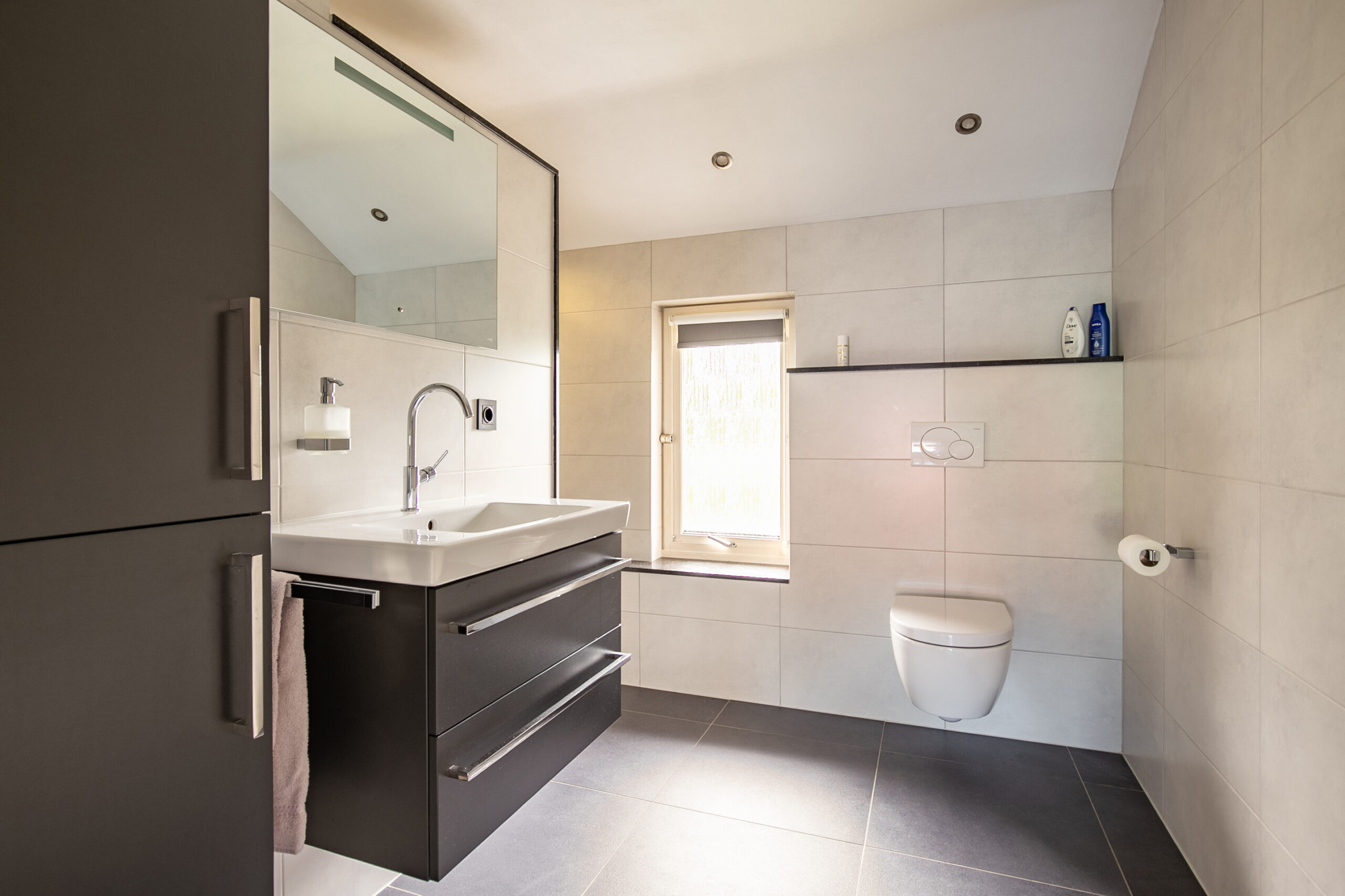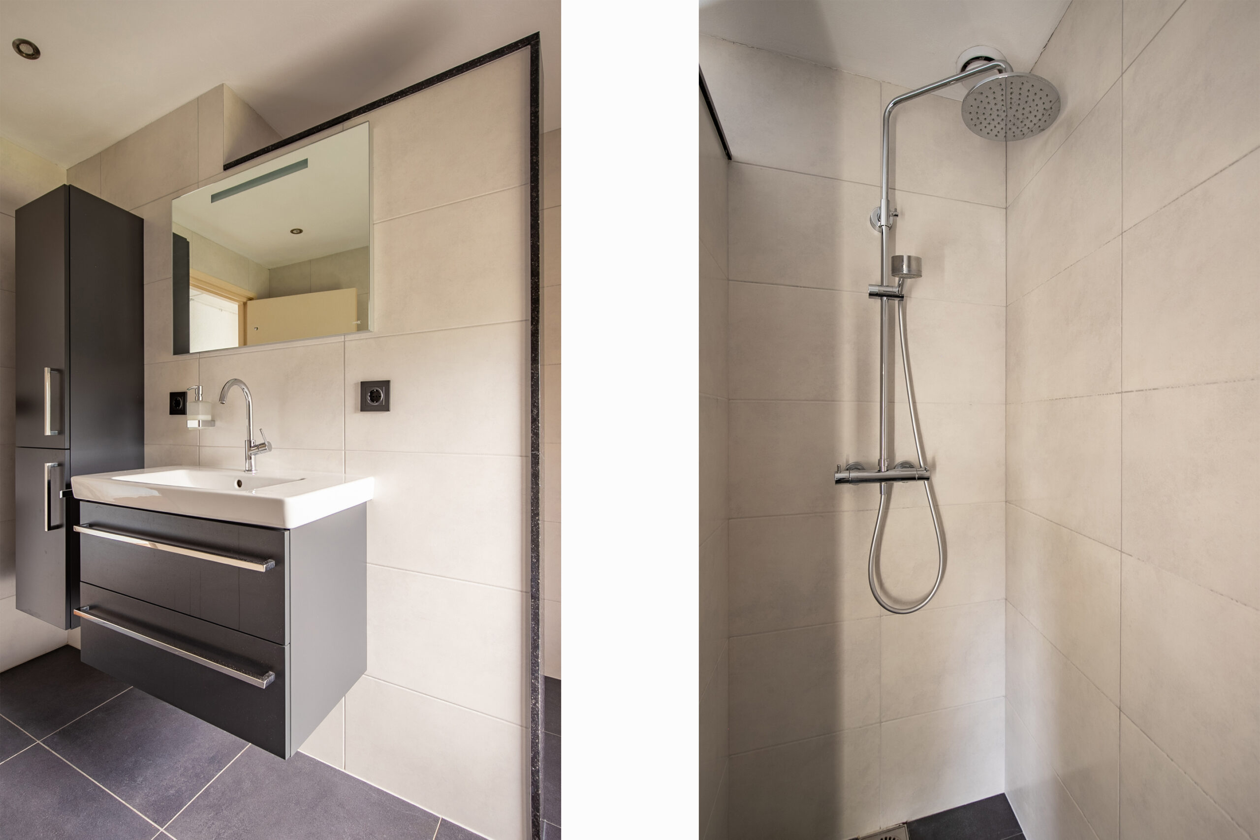 Zoals verwacht, voldoet ook de badkamer volledig aan de wensen van deze tijd. De ruimte is modern betegeld in een neutrale kleurstelling en compleet ingericht met een inloopdouche, toilet en een wastafel.