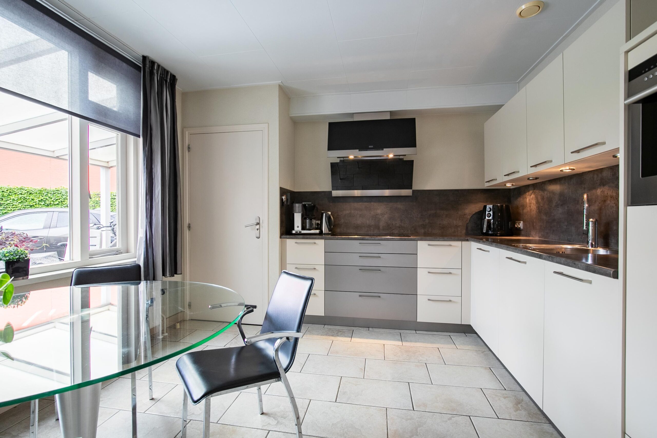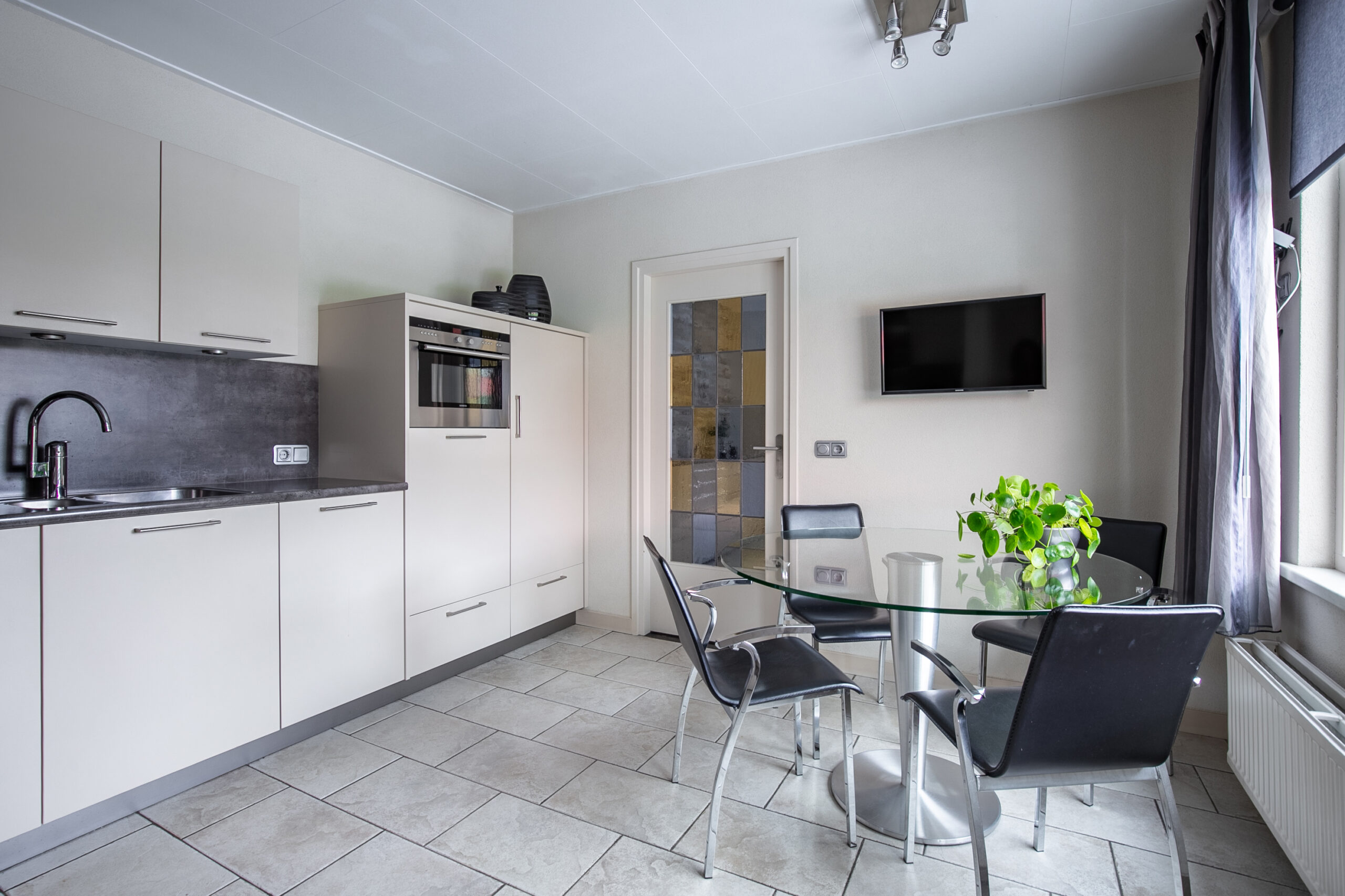Achter de woonkamer vinden we de leefkeuken. De moderne keuken, is geplaatst in een praktische hoekopstelling, waardoor je over meer dan voldoende werk- en opbergruimte beschikt. Daarnaast is het geheel voorzien van alle wenselijke inbouwapparatuur, zoals een kookplaat, afzuigkap, combi-magnetron, vaatwasser en een koelkast.