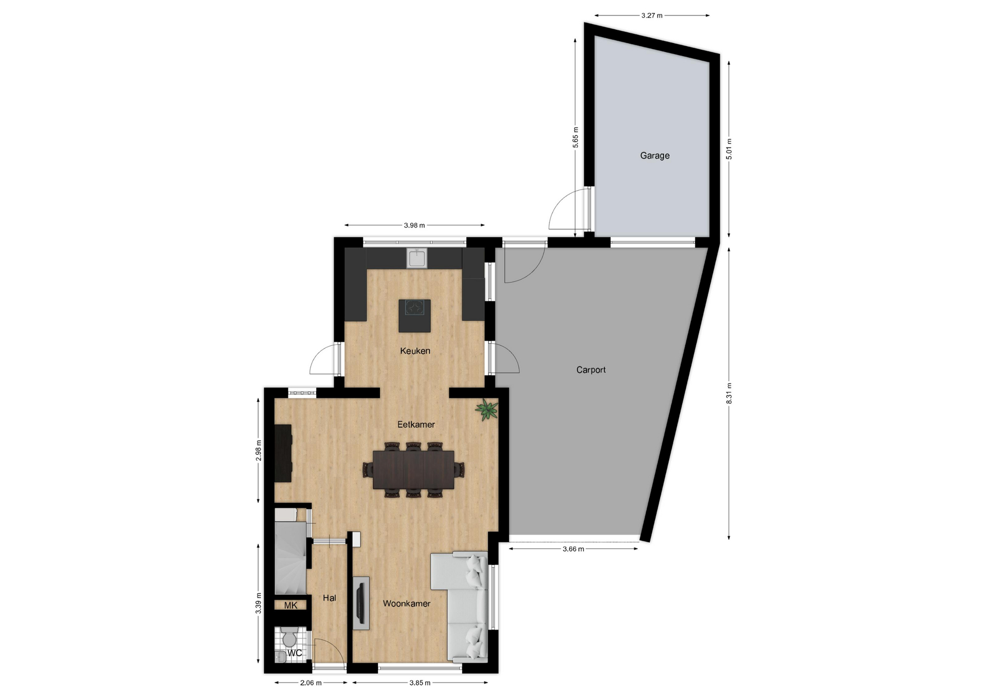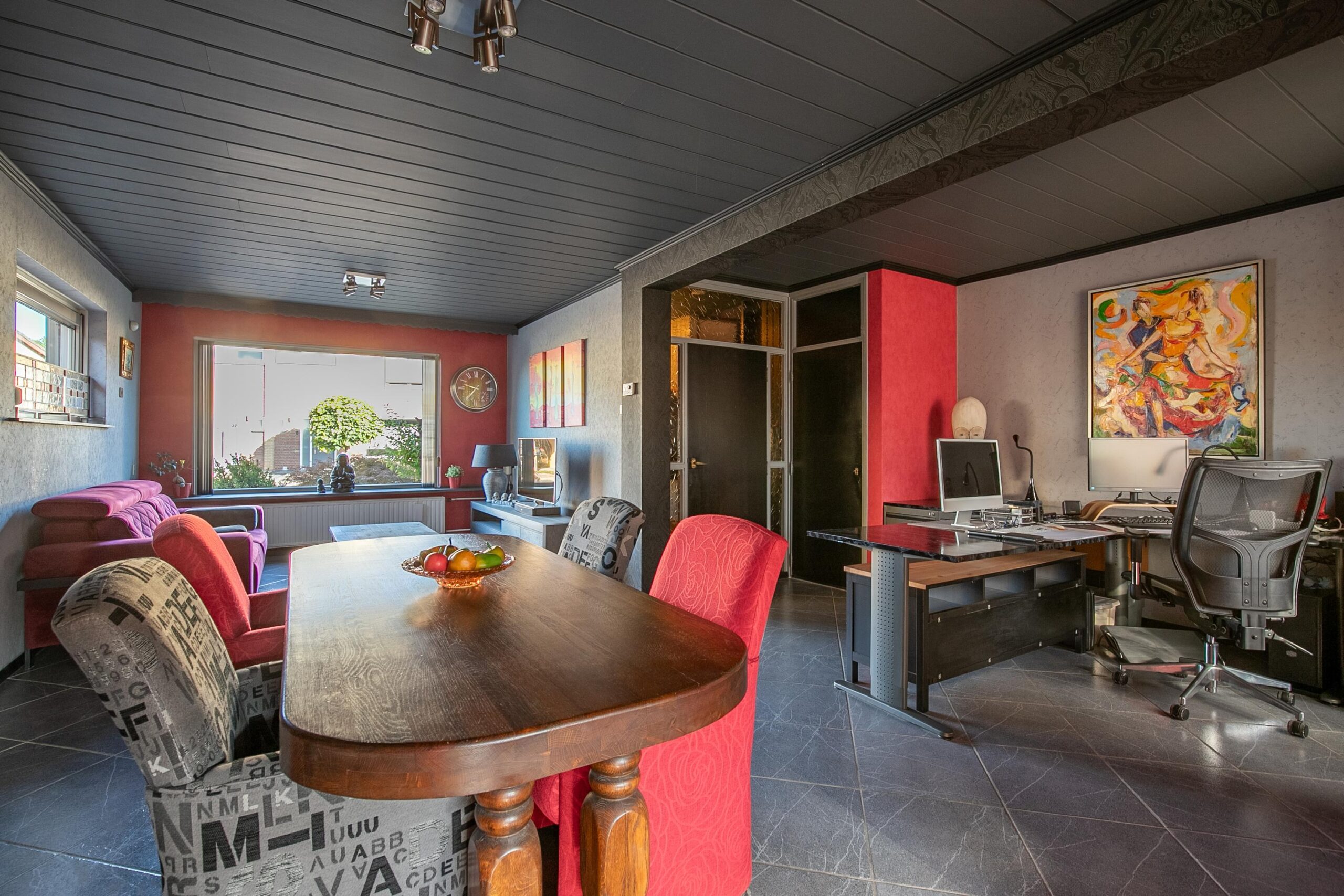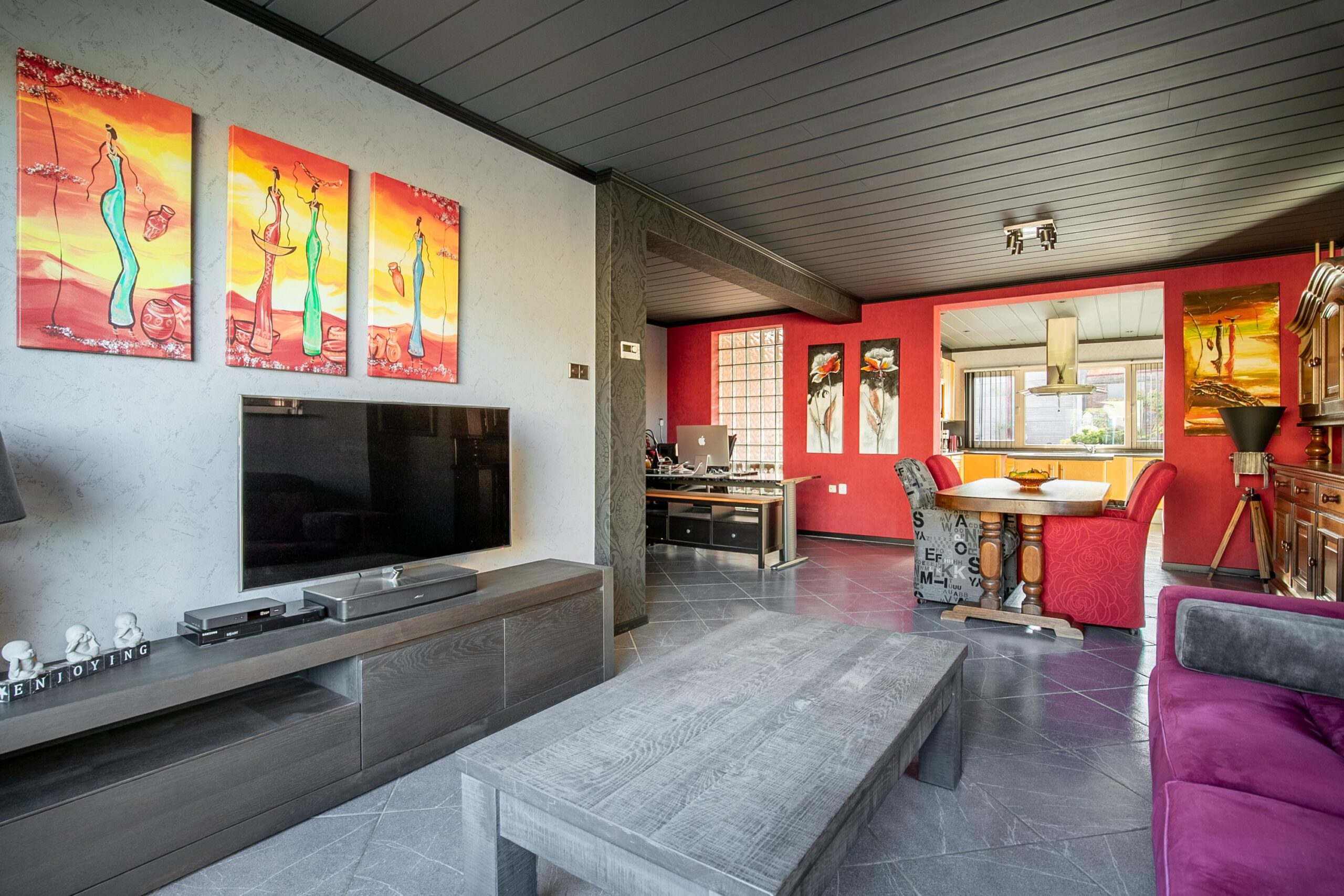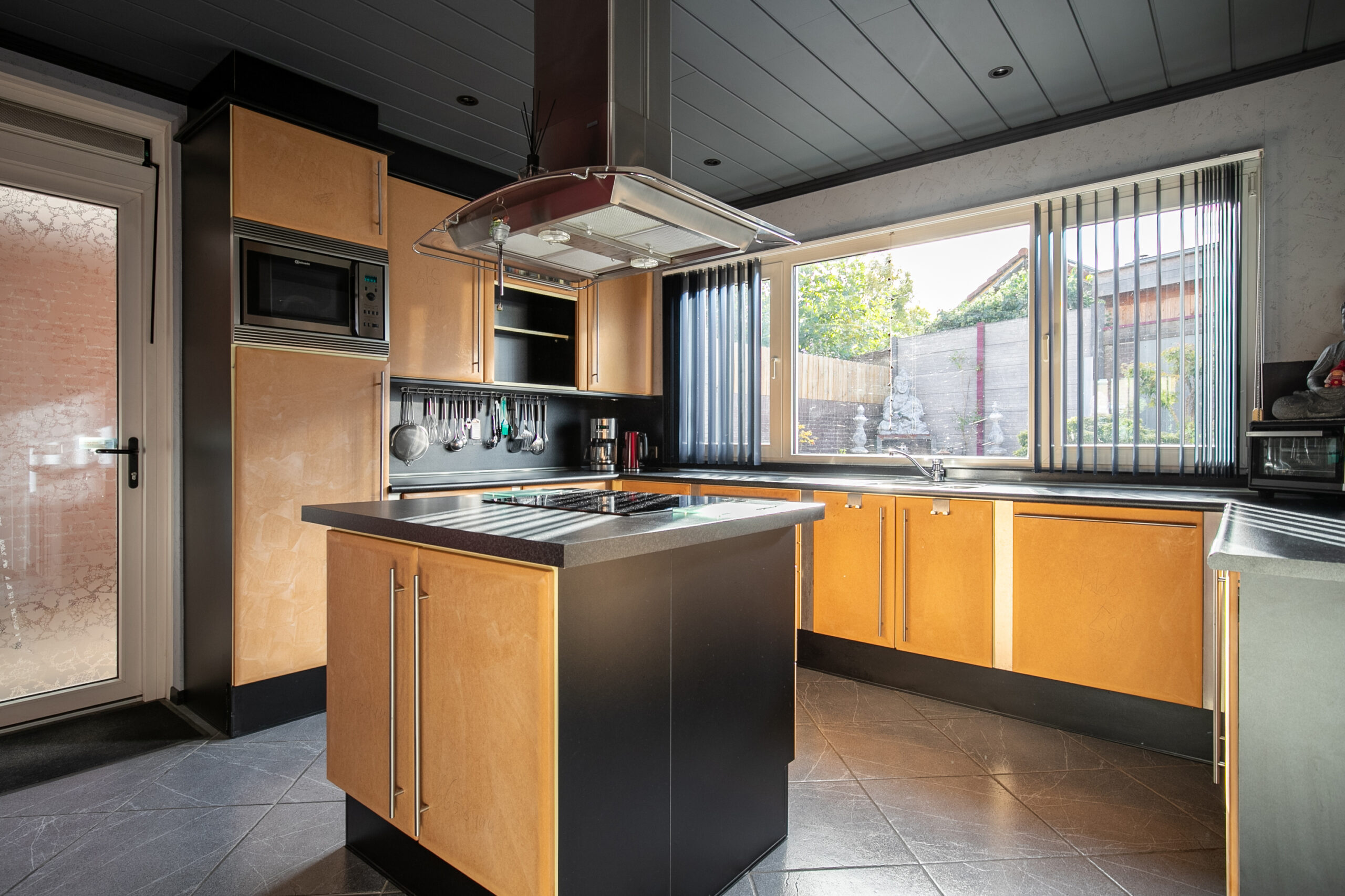 De woonkamer is royaal opgezet met een zitgedeelte aan de voorzijde (ca. 13 m²) en een ruim eetgedeelte (ca. 25 m²). Vloerverwarming en airconditioning zorgen hier voor extra comfort. Een praktische trapkast, momenteel in gebruik als wasruimte, biedt extra bergruimte. De halfopen keuken (ca. 16 m²) is voorzien van een kookeiland en diverse inbouwapparatuur: inductiekookplaat, vaatwasser, koelkast, vriezer, combi-oven en afzuigkap. Vanuit de keuken is er toegang tot de achtertuin en tot de overdekte carport met zonnepanelen.