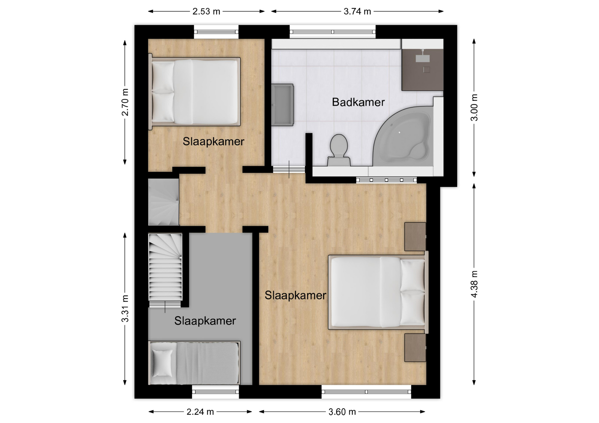Op de eerste verdieping bevinden zich drie slaapkamers en de badkamer. De ouderslaapkamer (ca. 16 m²) beschikt over airconditioning die krachtig genoeg is voor de gehele verdieping. De overige twee kamers zijn ca. 7 m² en 6 m² groot. Vanuit de kleinste kamer is via een vaste trap de tweede verdieping bereikbaar. De badkamer (ca. 11 m²) is ruim en compleet ingericht met een ligbad, douche en toilet.