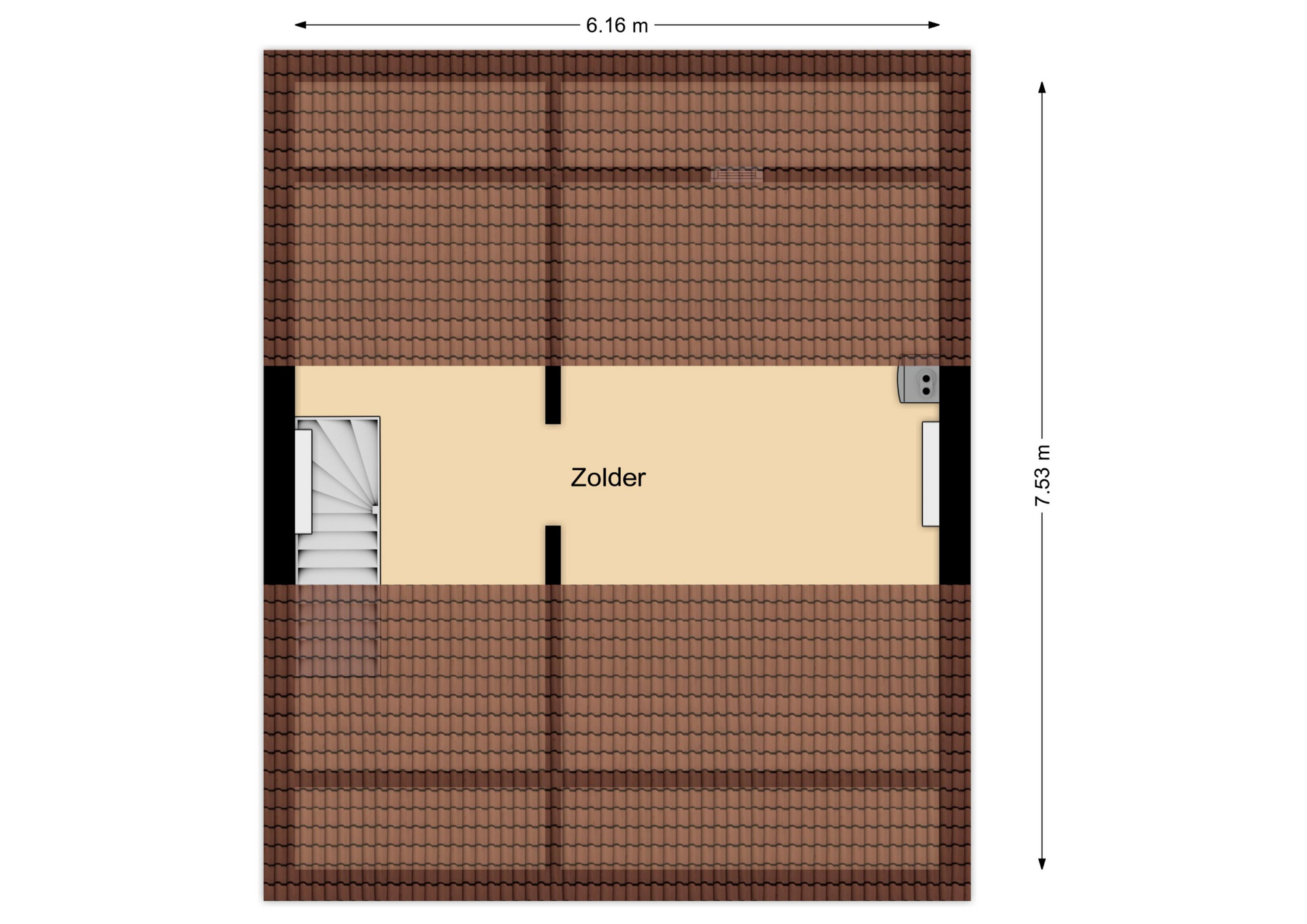 De zolder is bereikbaar via een vaste trap en biedt de mogelijkheid voor een extra slaapkamer of werkruimte. Momenteel wordt deze verdieping gebruikt als bergzolder. Hier bevindt zich ook de cv-installatie (Nefit, bouwjaar 2008, eigendom).