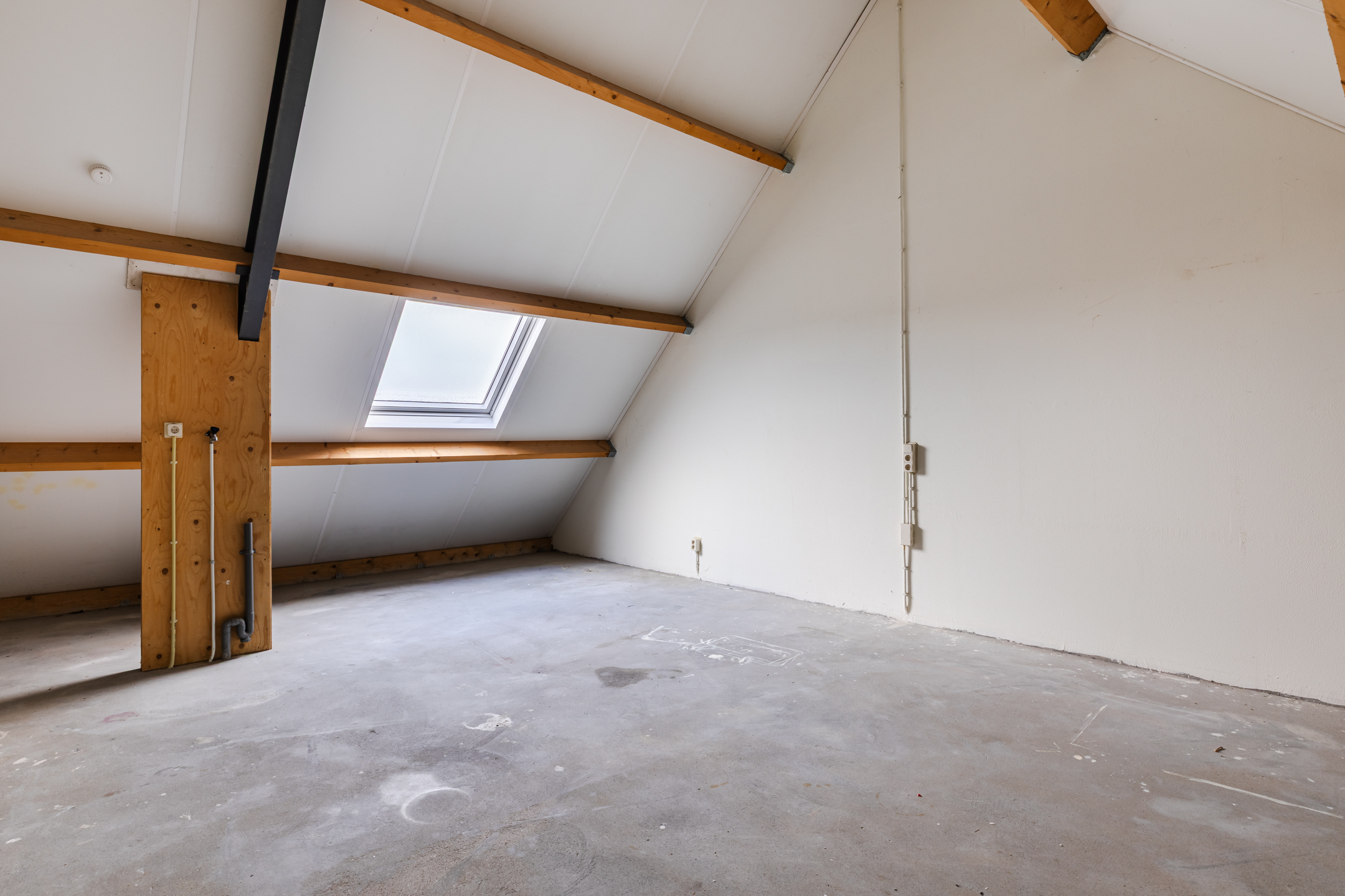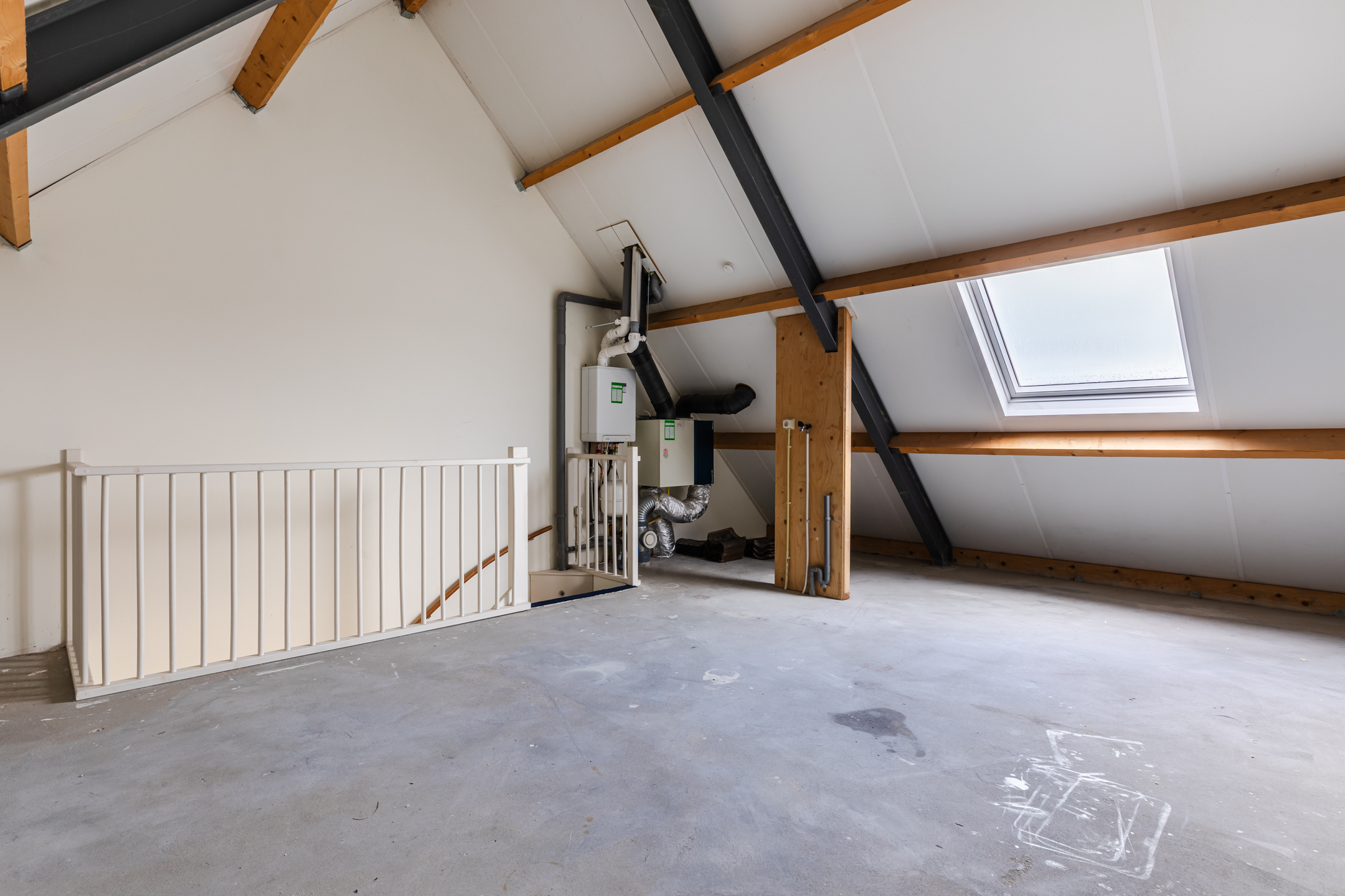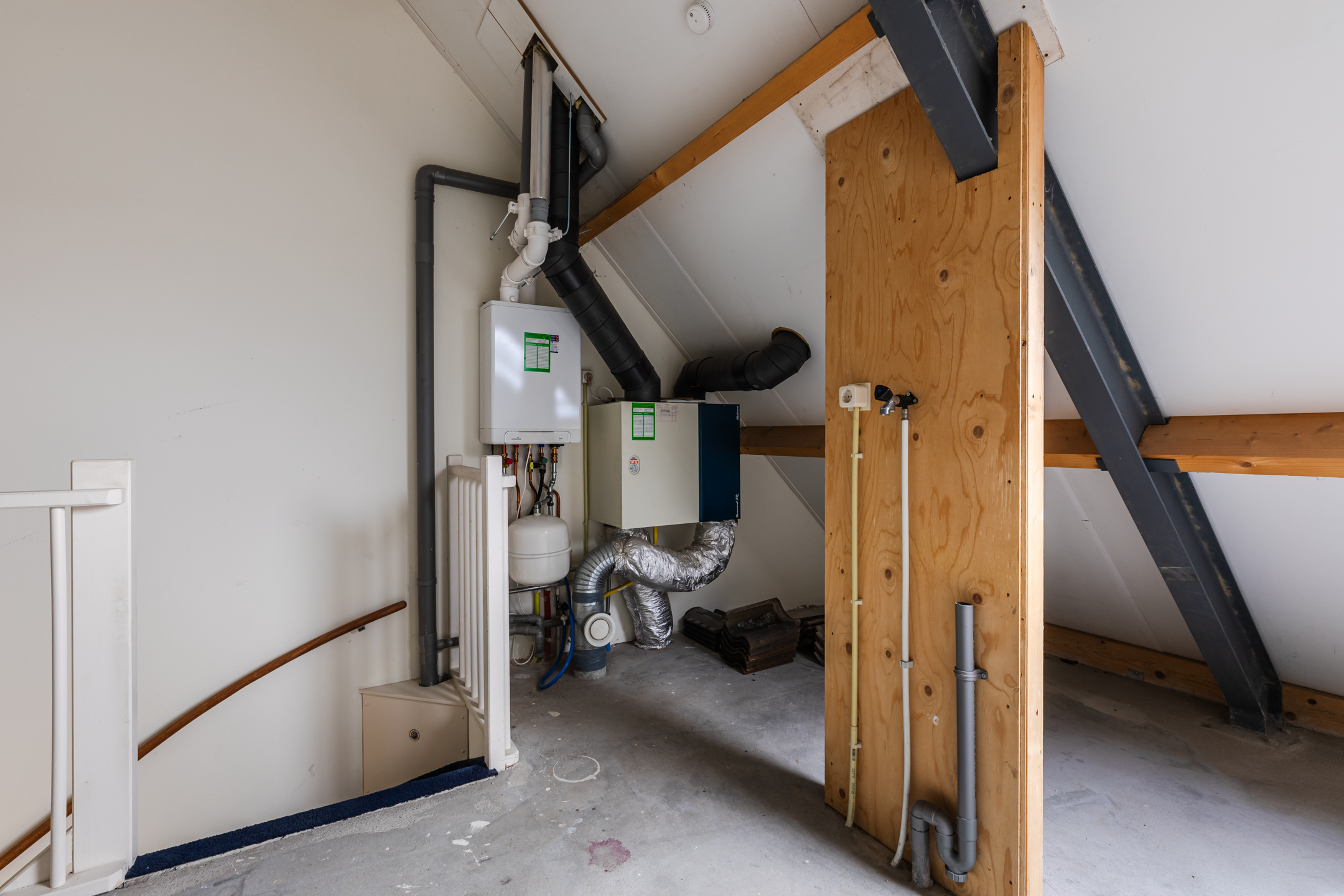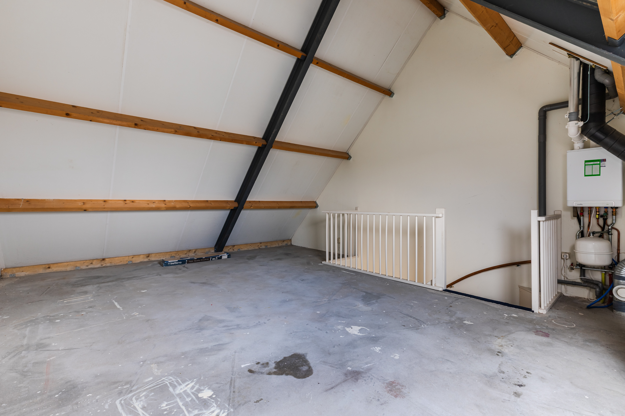 Middels vaste trap is er toegang tot deze riante, hoge verdieping 5.73 x 5.40 (ca 31 m²) is bereikbaar met een vaste trap en voorzien van een dakraam. Hierdoor kan hier eenvoudig een extra slaapkamer gerealiseerd worden en biedt dit eveneens plaats voor bergruimte. Door de hoogte van deze verdieping is het zelfs mogelijk om hier nog een bergzolder te realiseren, in de vorm van een vliering. Tevens bevindt zich hier de opstelling van combi c.v.-installatie (Intergas HRE 2022) en de aansluitpunten voor wasautomaat/droger. Dit is een ideale, multifunctionele ruimte die gebruikt kan worden als werkkamer, speelruimte, hobbykamer, logeerkamer enz.