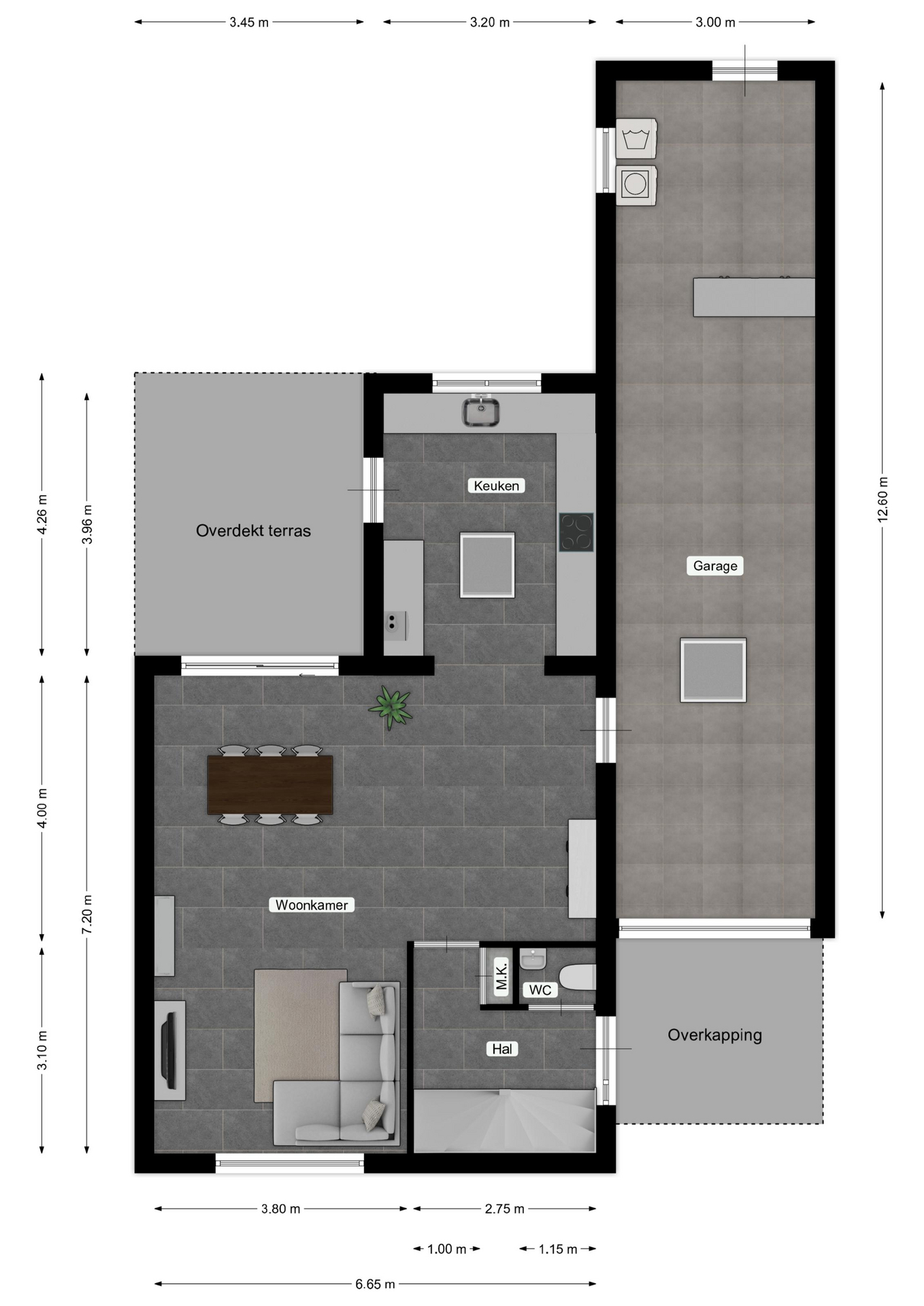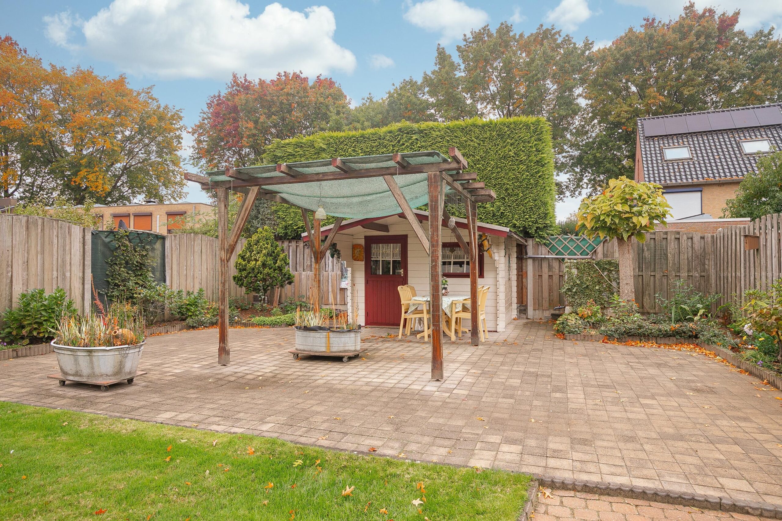 – Het overdekte terras heeft rondom funderingen en kan zodoende bij de woning betrokken worden;