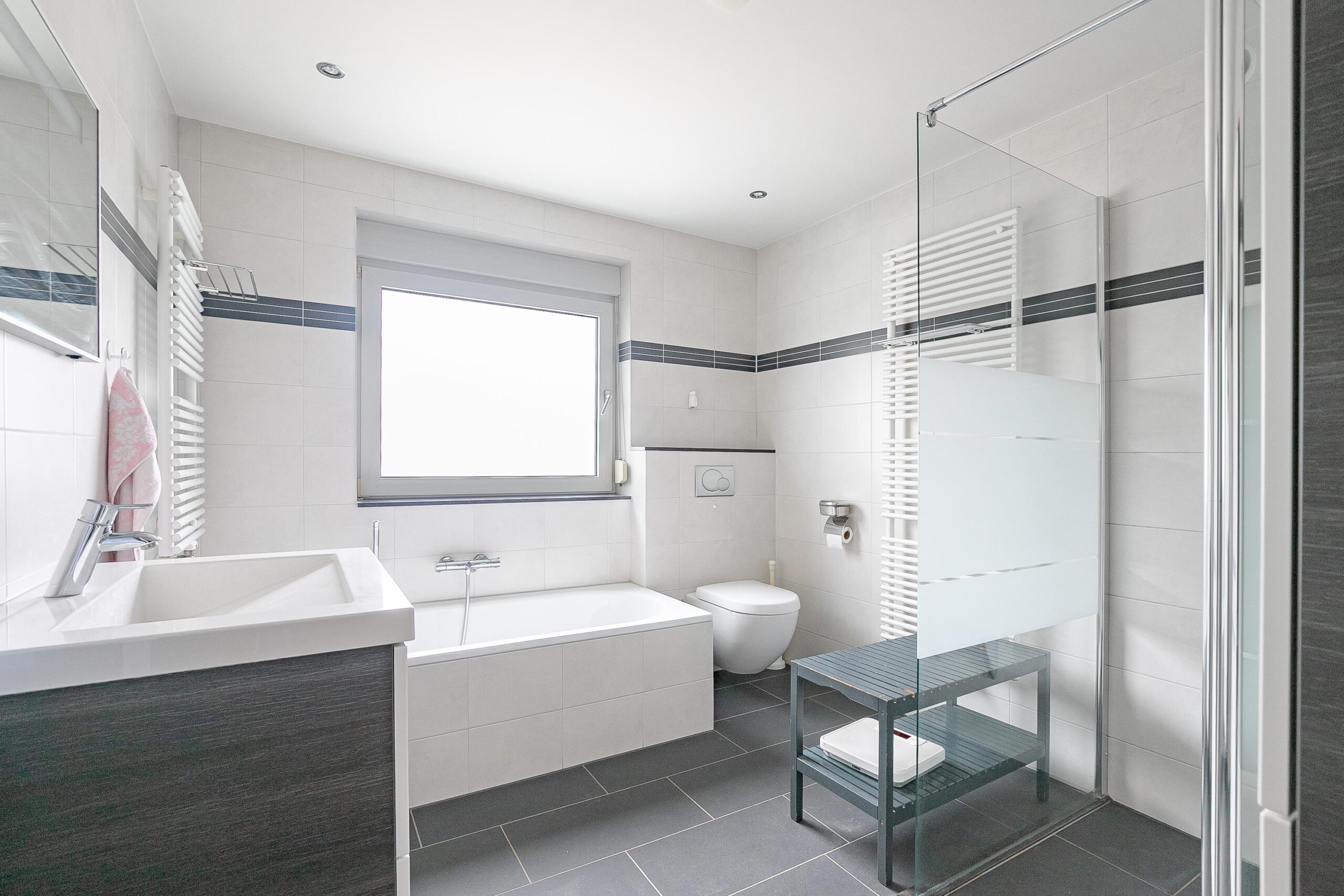 - Badkamervoorzieningen Ligbad, toilet, douche, wastafel, wastafelmeubel