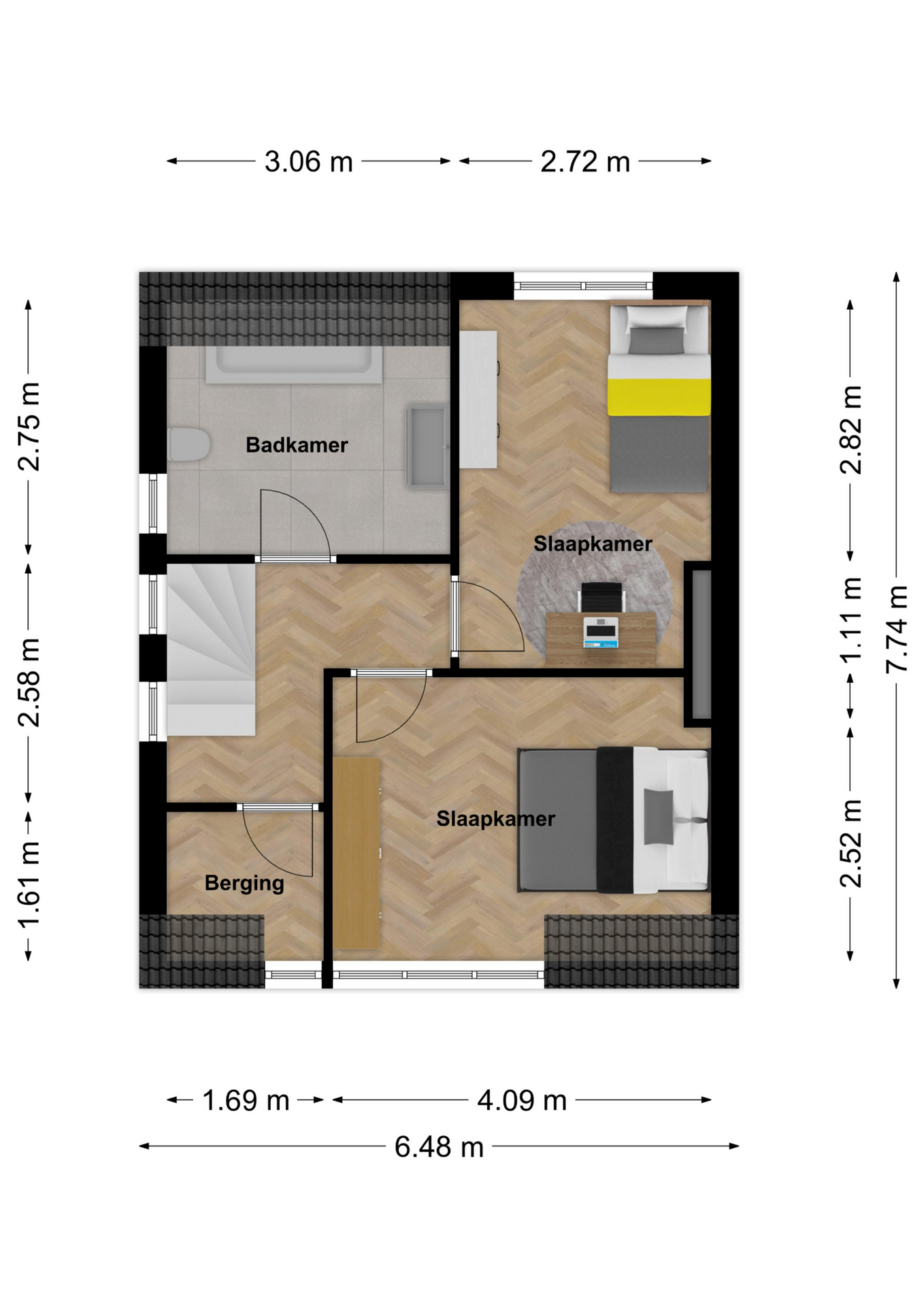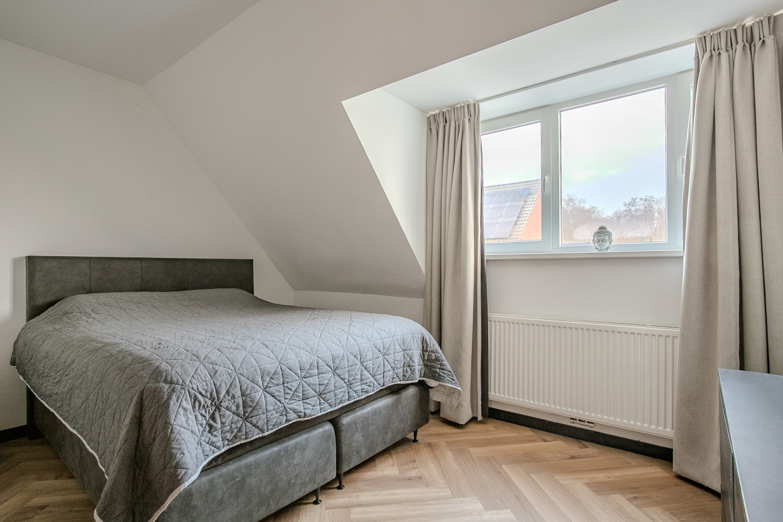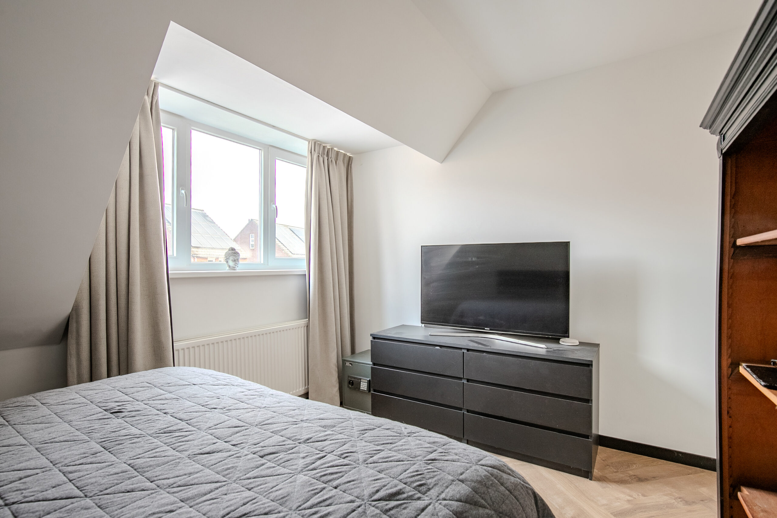 Eerste verdieping: op de eerste verdieping bevinden zich drie slaapkamers – twee grote en één kleinere – allemaal afgewerkt met strakke wanden en nieuwe vloeren. De luxe badkamer is voorzien van een douche, ligbad, modern wastafelmeubel, een tweede toilet en een designradiator.