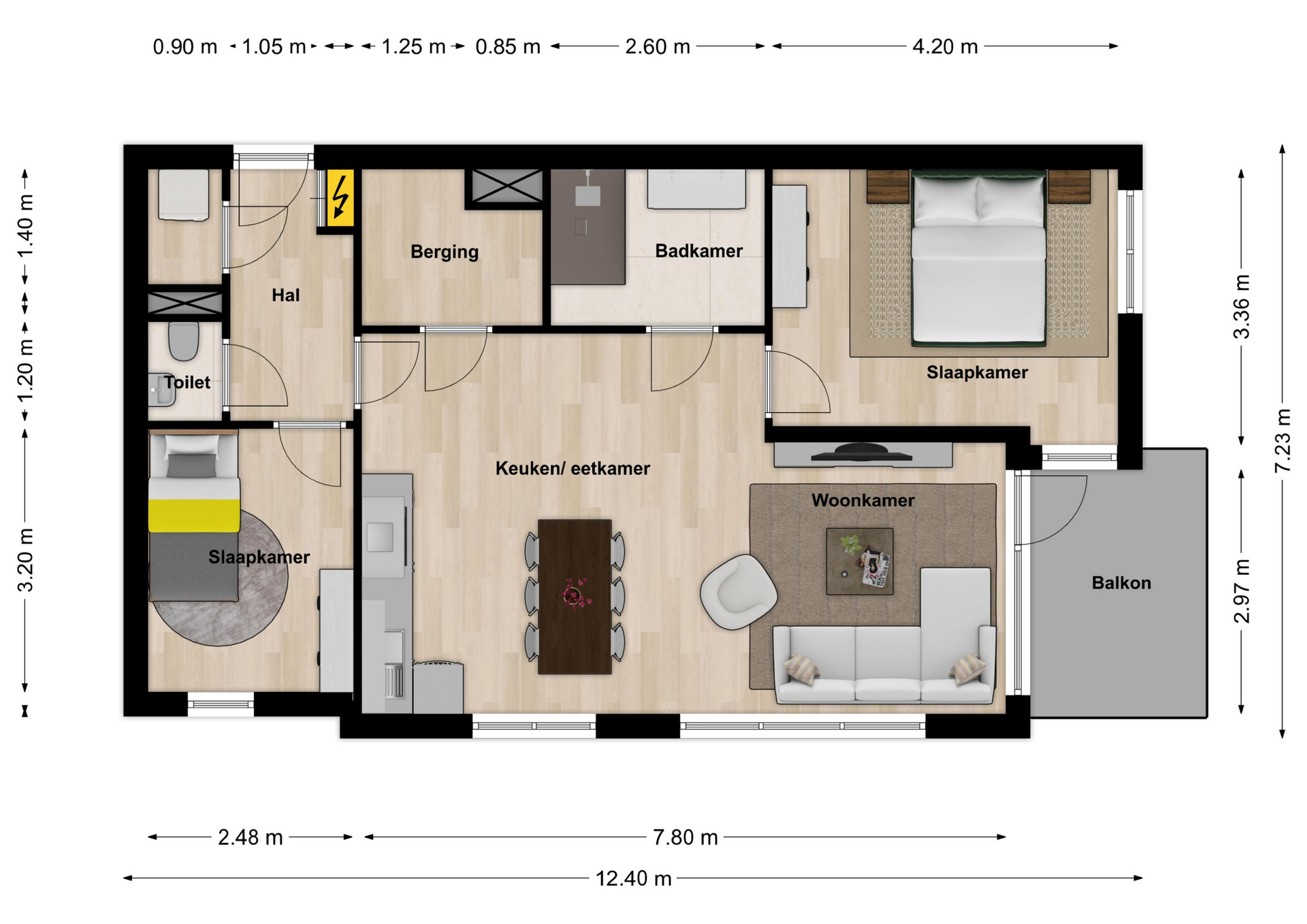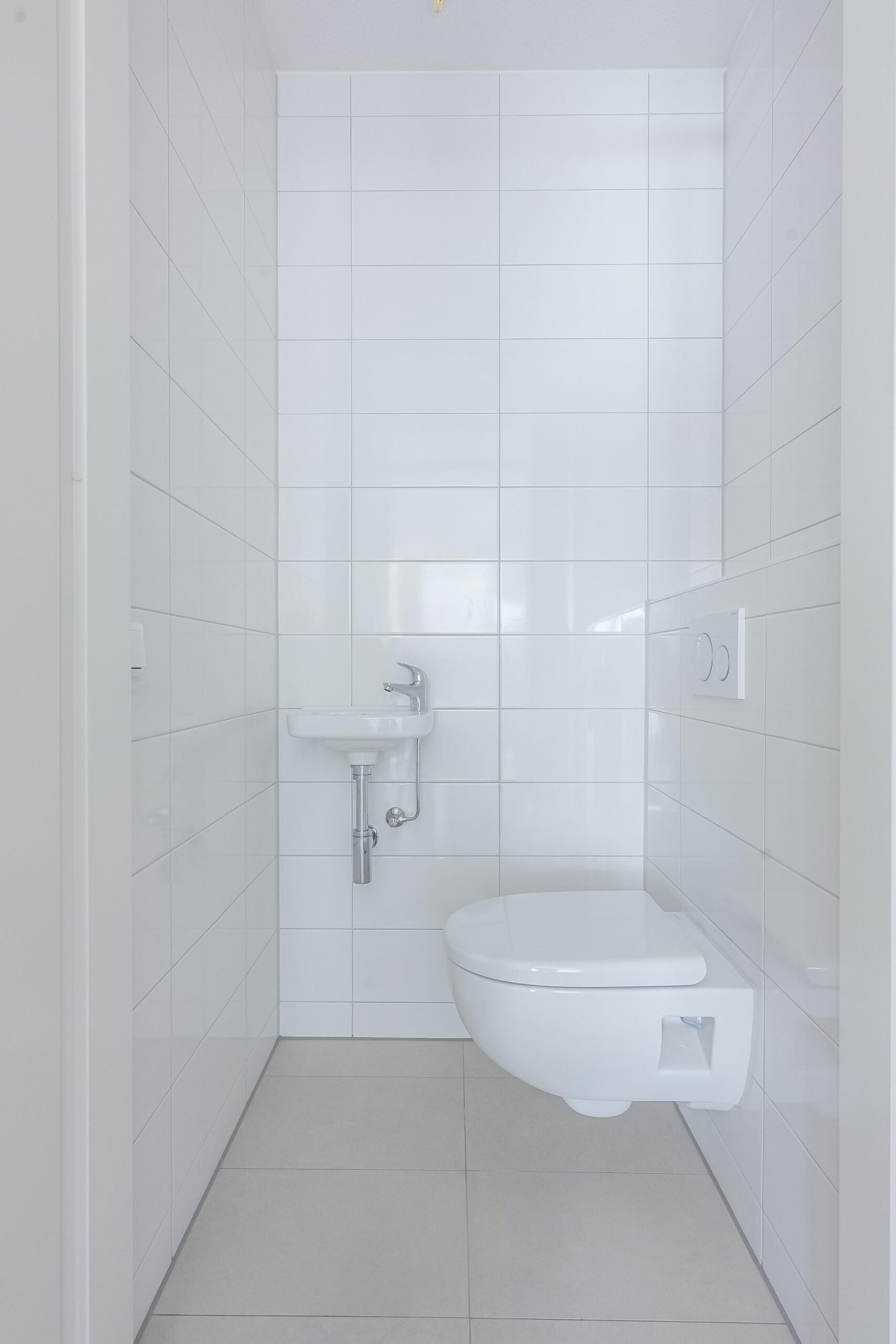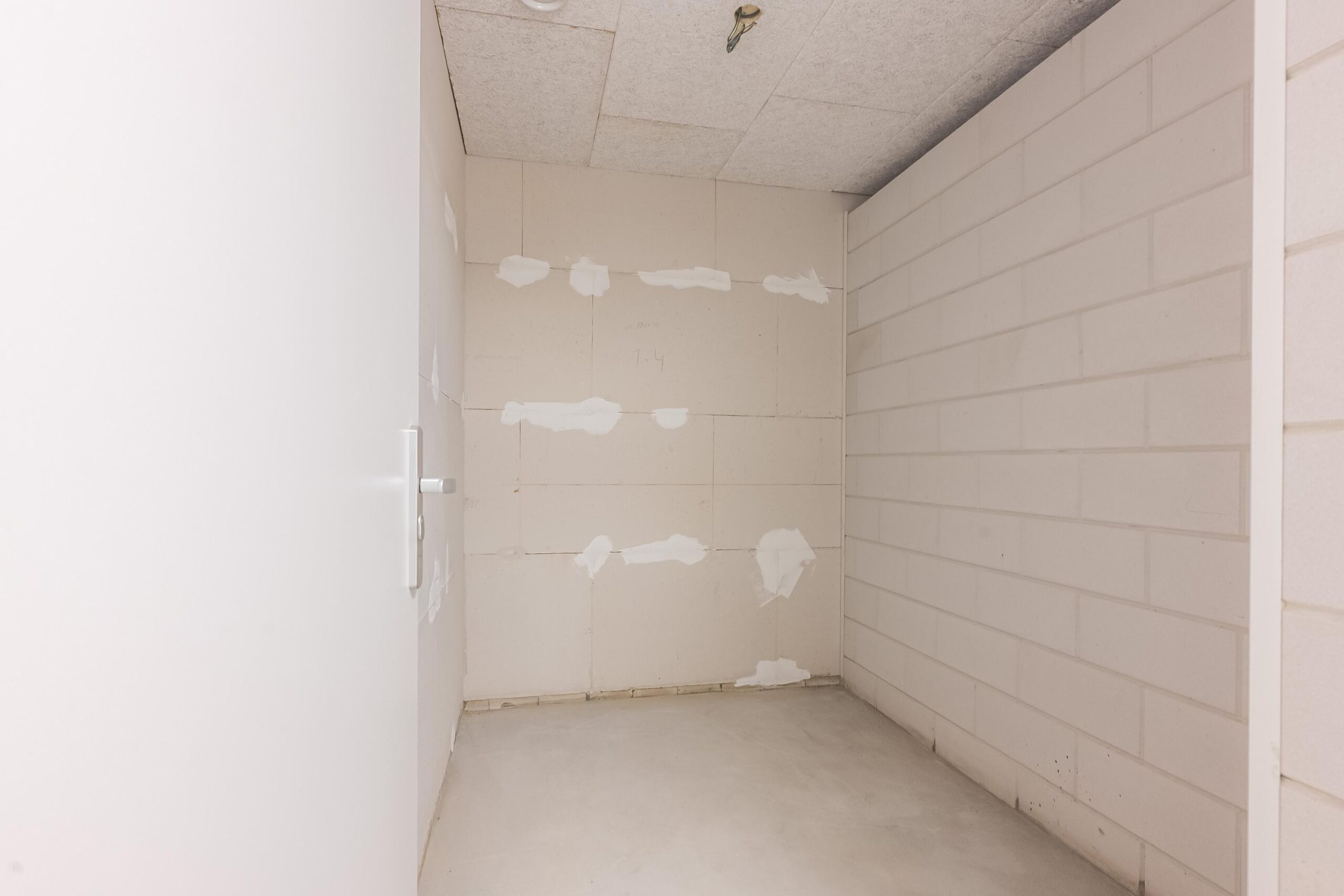 Vanuit de woonkamer is er toegang tot de berging, badkamer en tweede slaapkamer (ca. 3,10 x 4,20 m). De badkamer is uitgerust met een inloopdouche met glazen wand, dubbele wastafel met meubel, handdoekradiator en anti condens spiegel voorzien van ingebouwde verlichting.