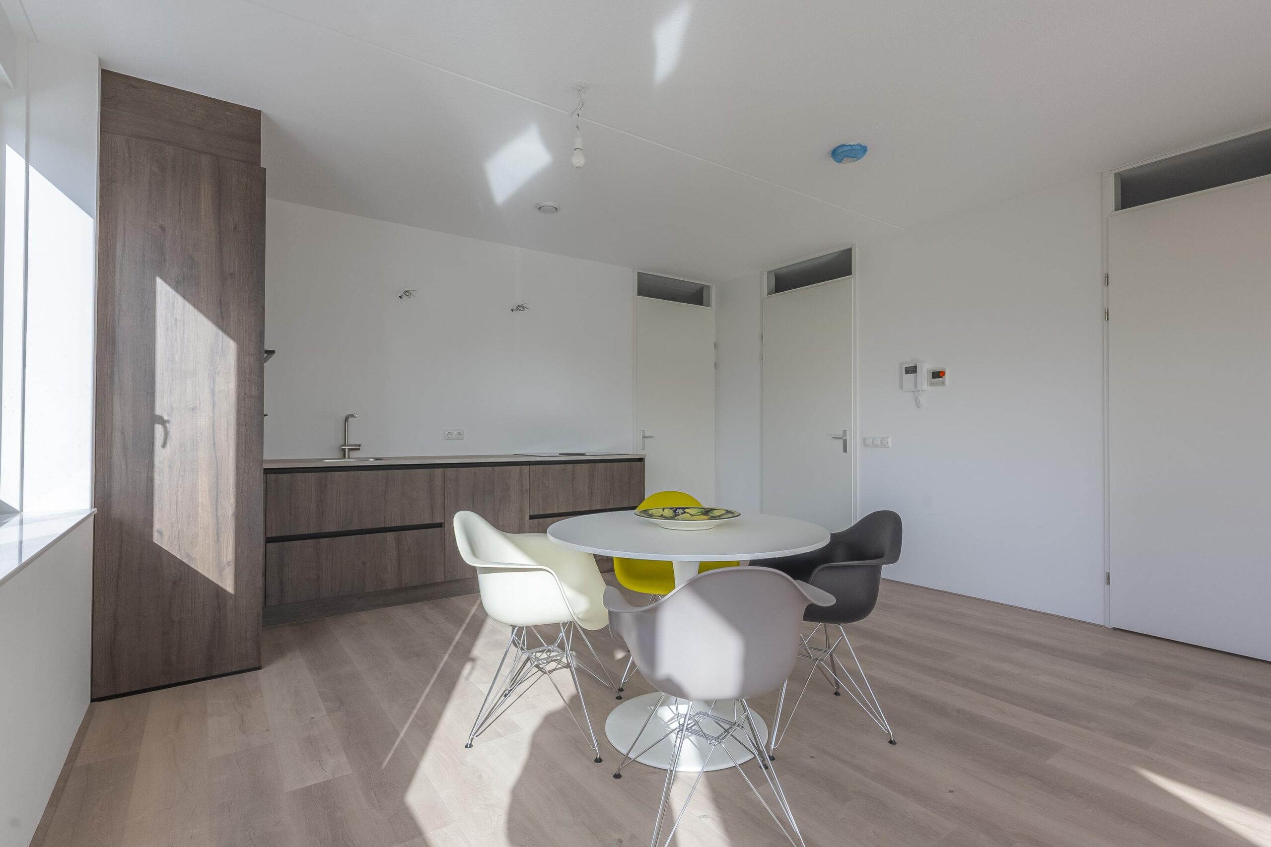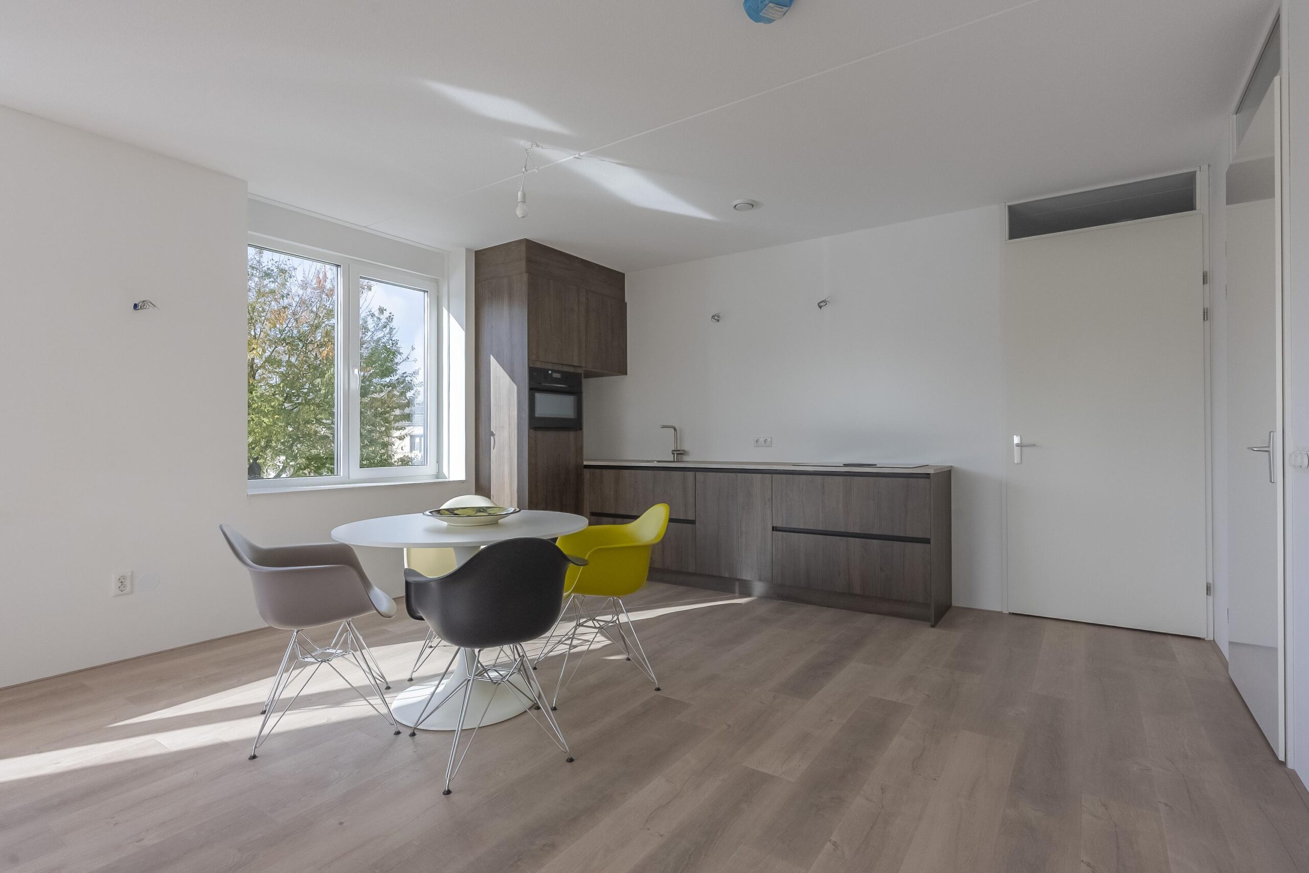 De lichte woonkamer met open keuken beschikt over grote raampartijen en een zuidgericht balkon. De keuken in L-opstelling is uitgevoerd in een donkere notenhouttint met licht werkblad en voorzien van een Bora-inductiekookplaat, koelkast, spoelbak, vaatwasser en AEG-combi-oven.