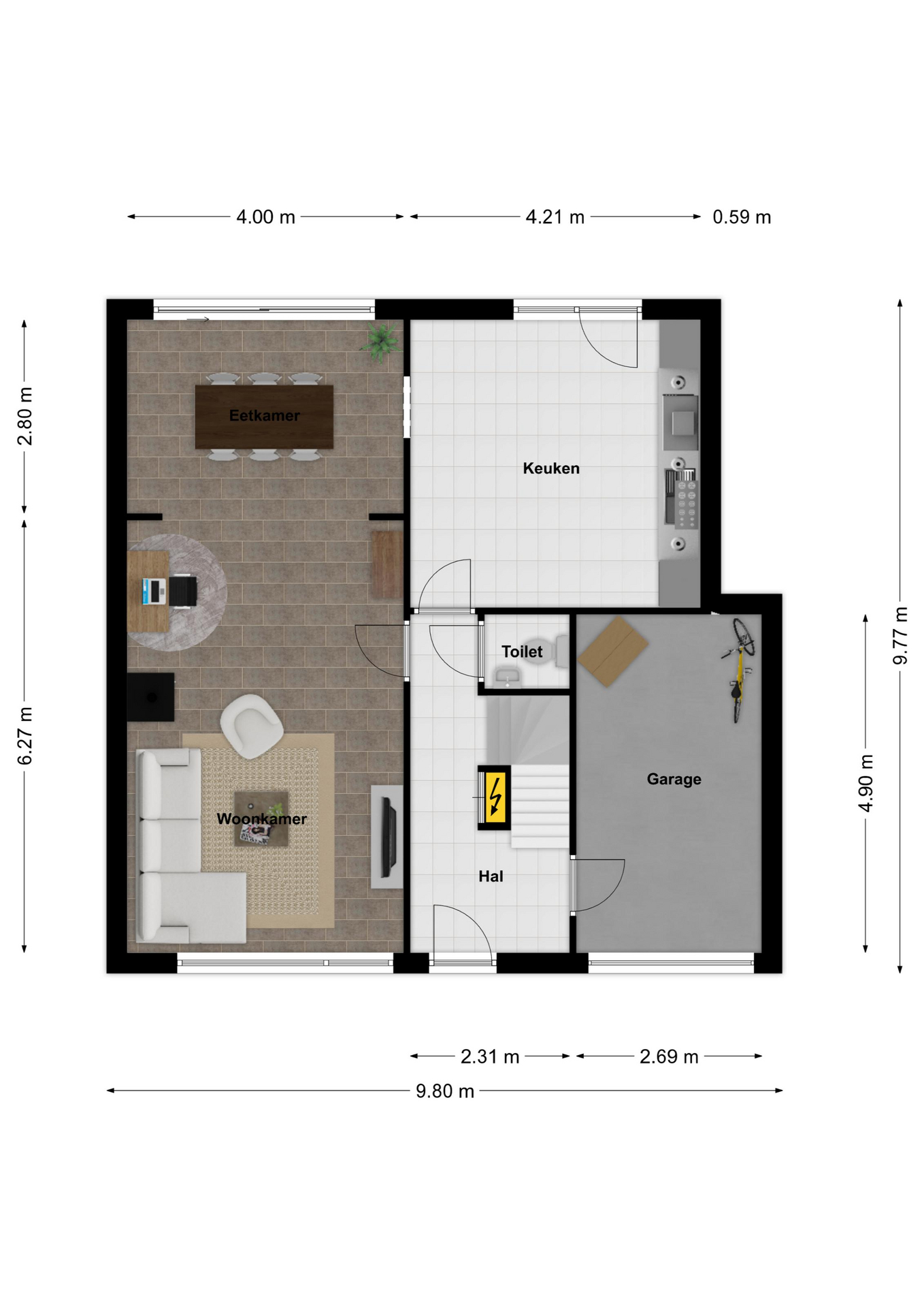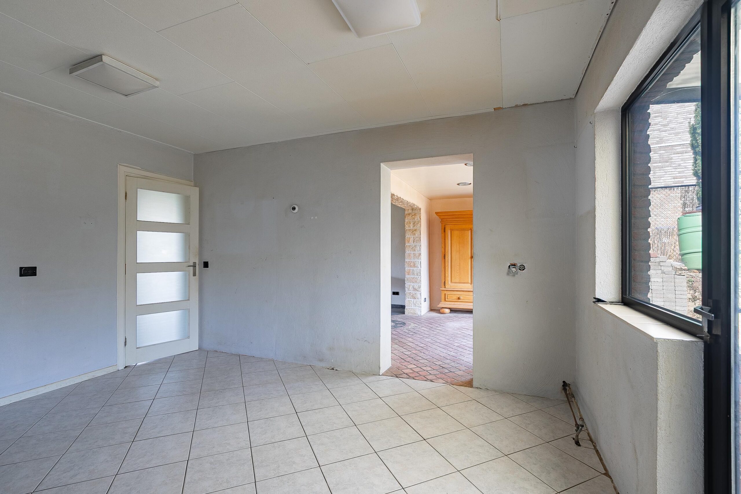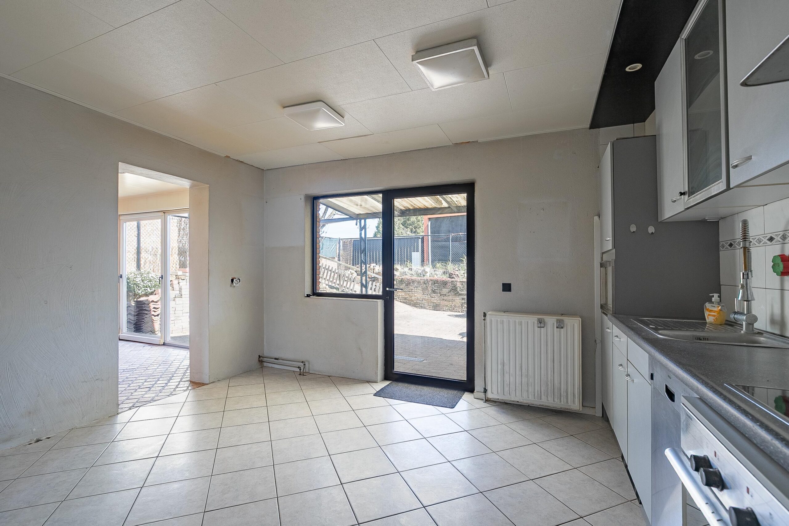 Entree. Hal met toegang tot garage met kantelpoort en oprit. Meterkast met dag- en nachtstroom en geheel betegelde toiletruimte met zwevend toilet en fontein. Sfeervolle zeer ruime woonkamer met plavuizenvloer, pellet kachel, veel lichtinval en schuifpui naar de tuin. De leefkeuken met tegelvloer is voorzien van een kunststof keukeninstallatie met navolgende apparatuur: elektrisch kookplaat, oven en afzuigkap.
