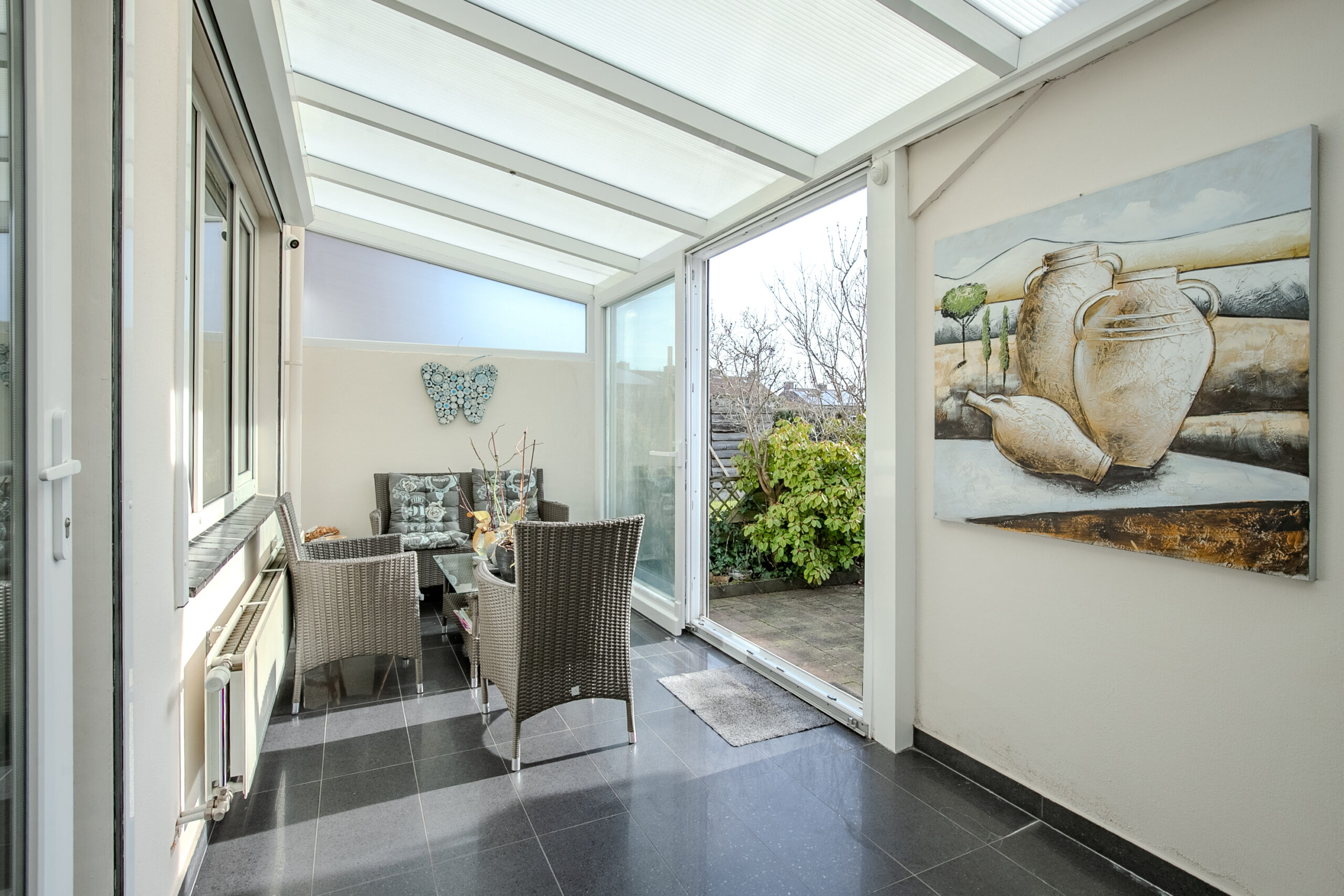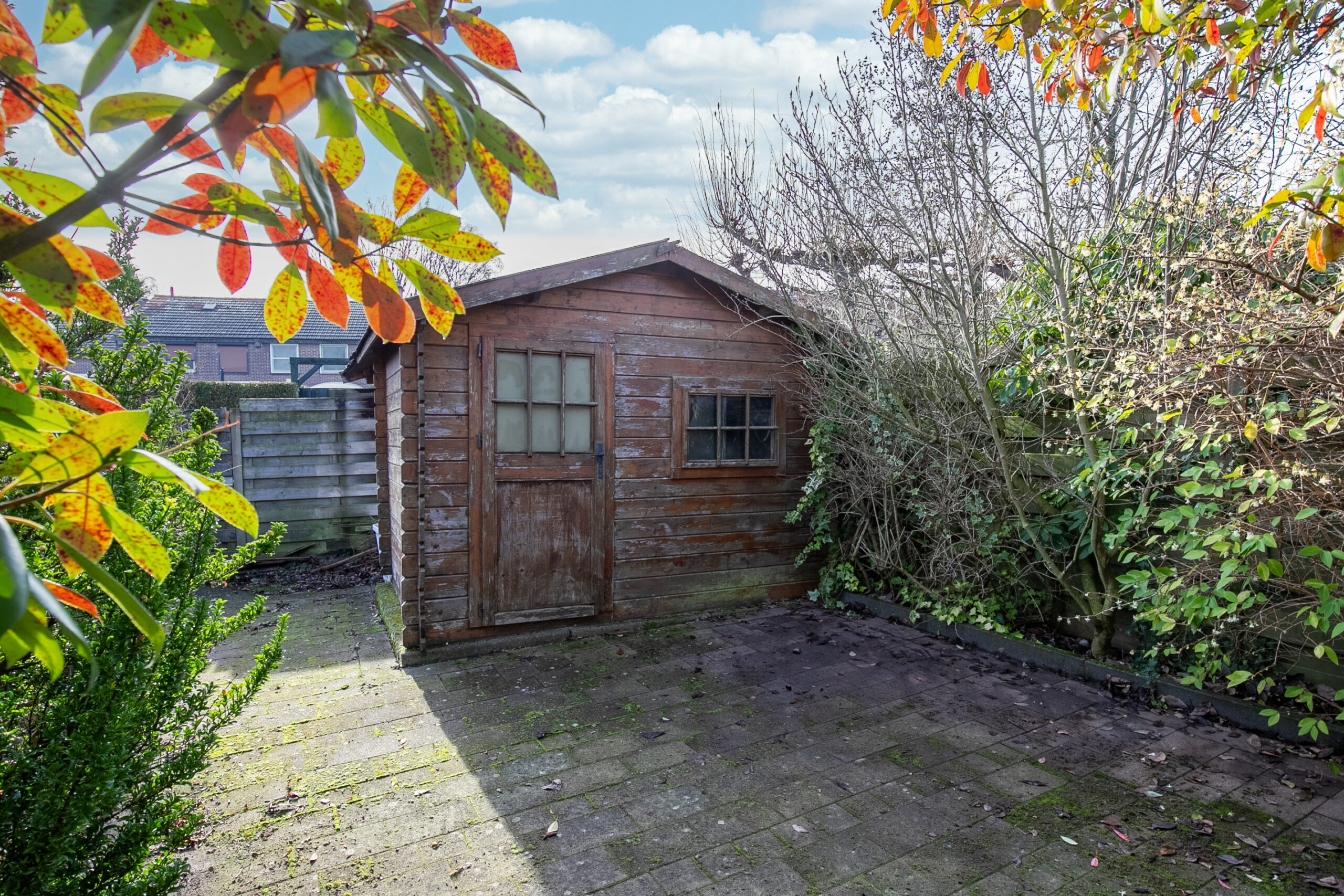 Vanuit de keuken is de tuinkamer bereikbaar. De verwarmde tuinkamer is voorzien van een schuifpui en biedt toegang tot de achtertuin en de stenen berging. In de stenen berging is het wasmachineaansluitpunt gerealiseerd. De tuin is onderhoudsvriendelijk aangelegd met beplanting en bevat een houten buitenberging.