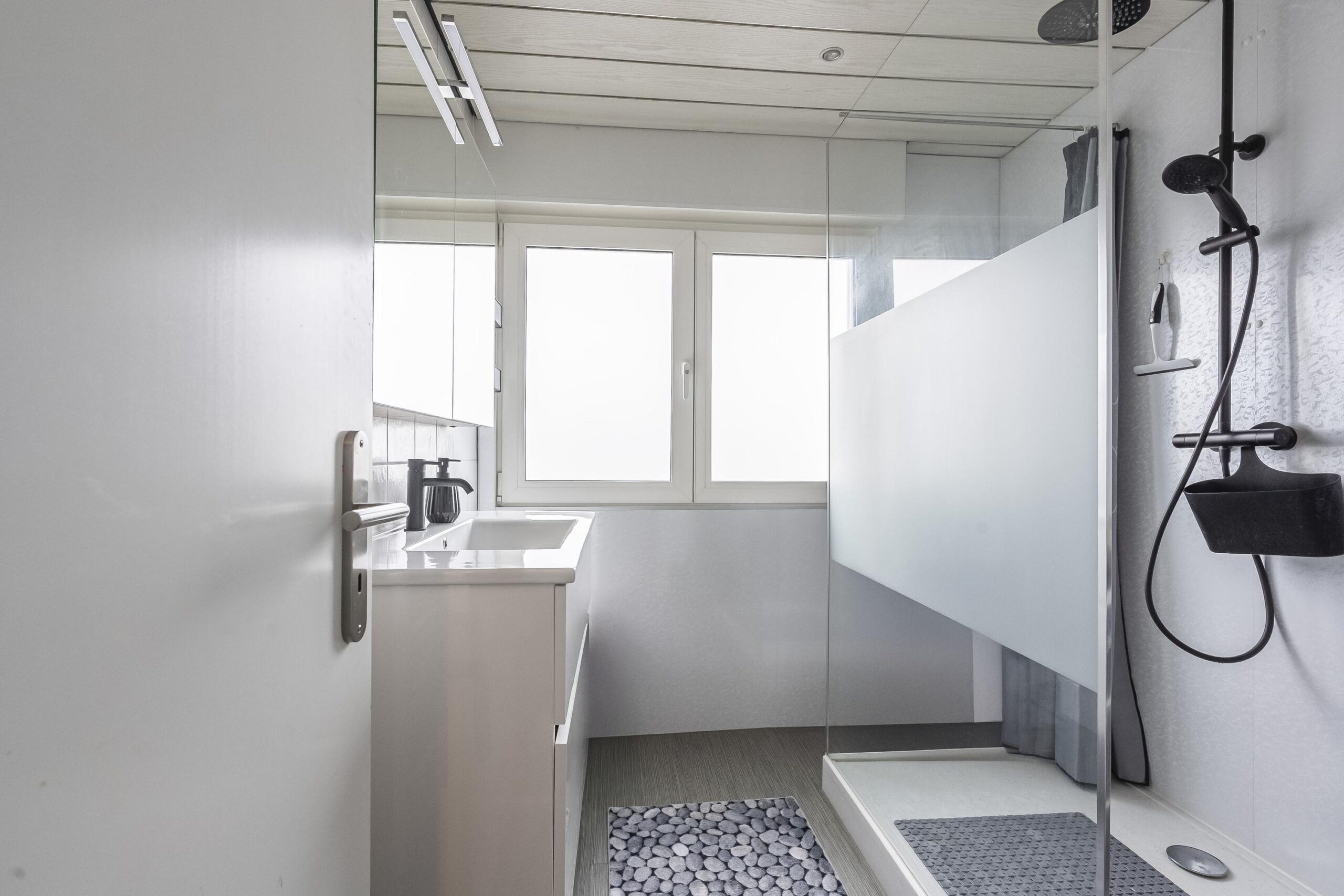 De badkamer is groot ca. 5 m² en is voorzien van een ruime douche en een wastafel met meubel.