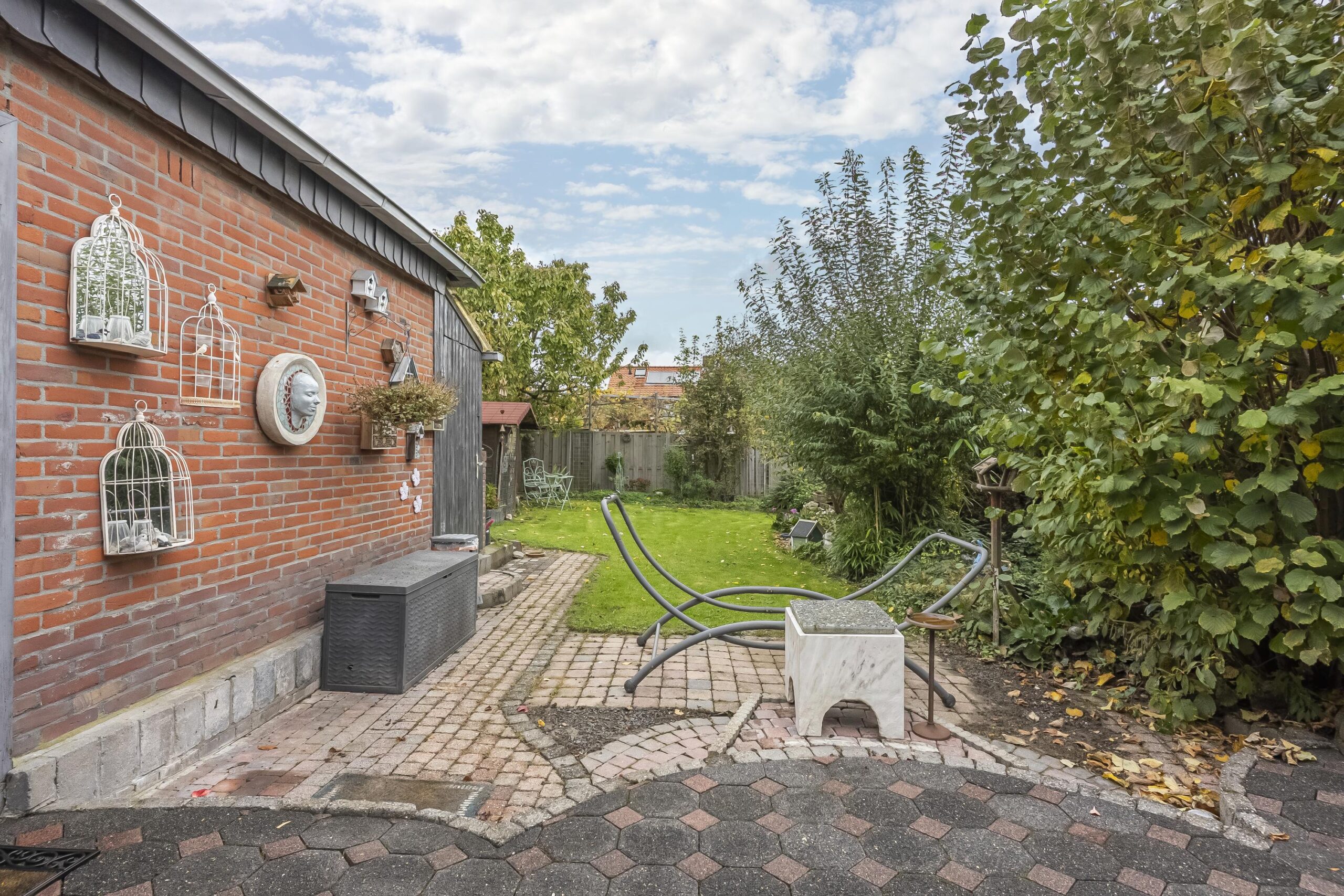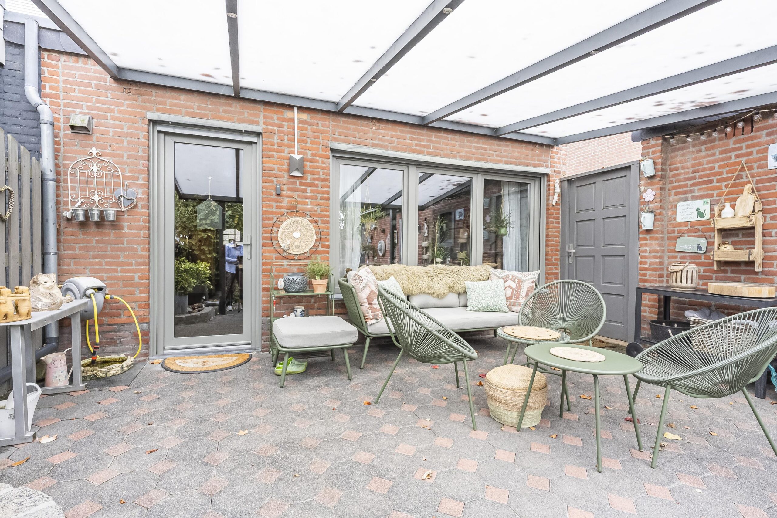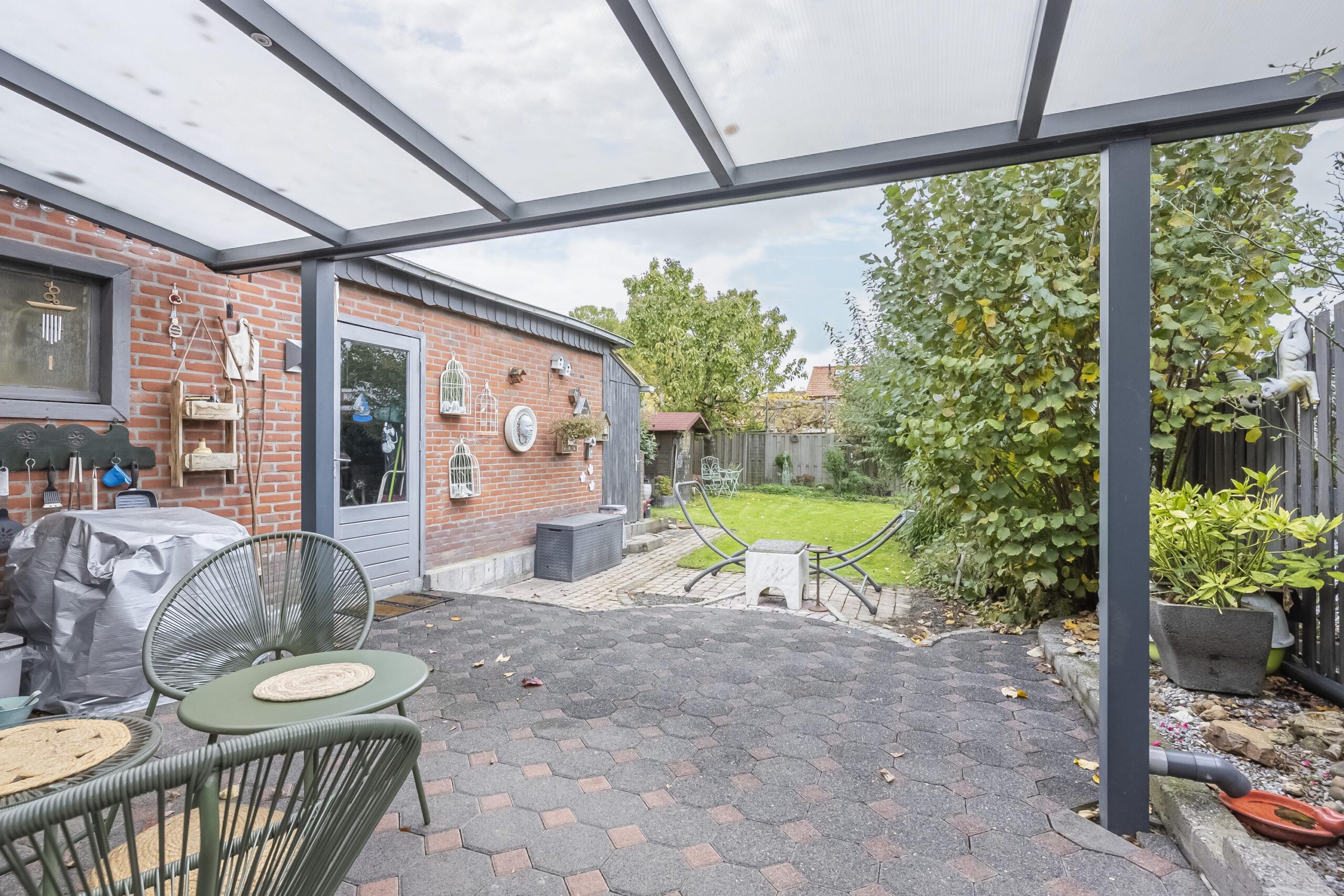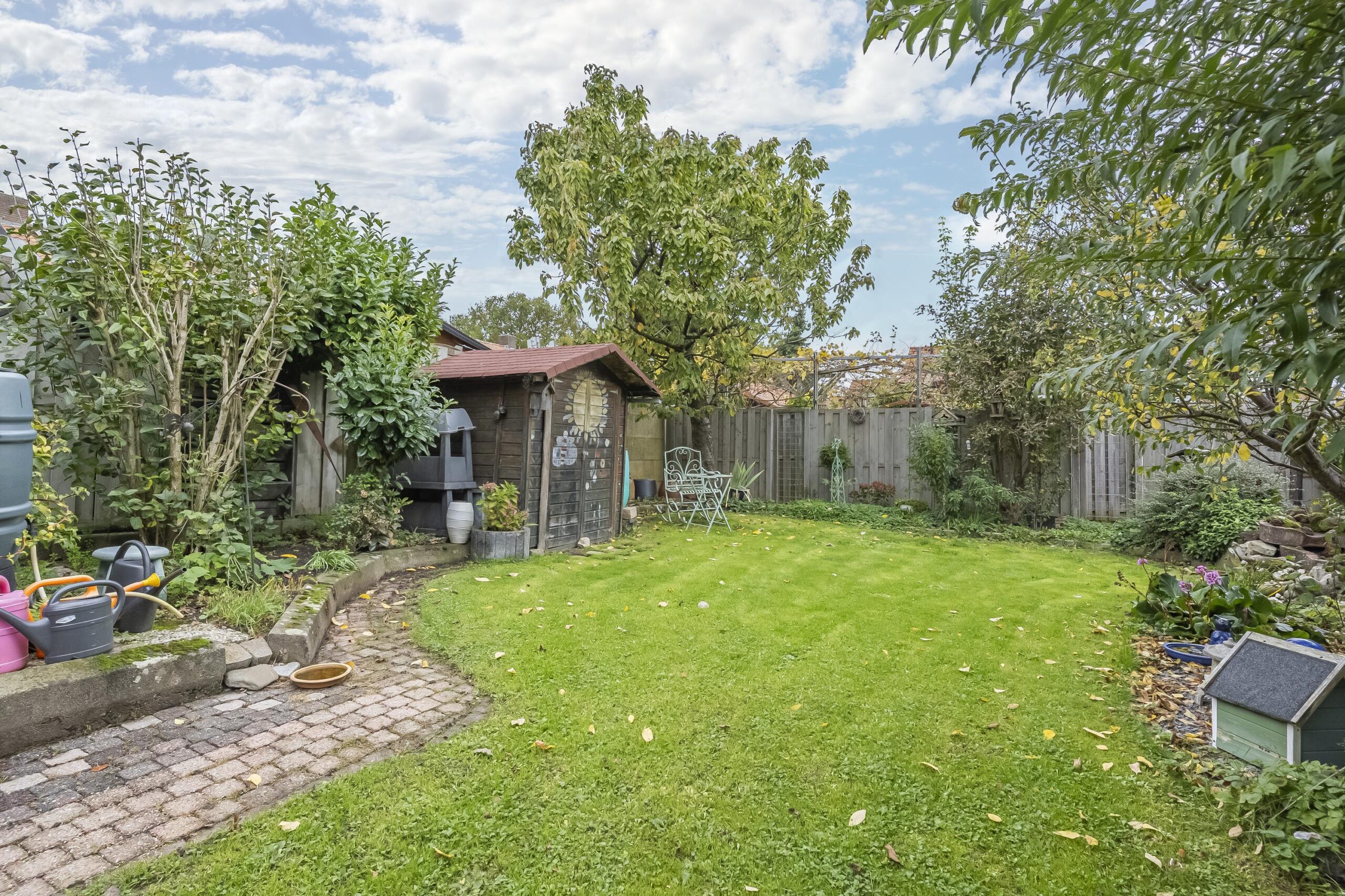 De gezellige achtertuin is gelegen op het noorden en is voorzien van een groot overdekt terras, een gazon en een houten berging. De tuin biedt veel privacy.