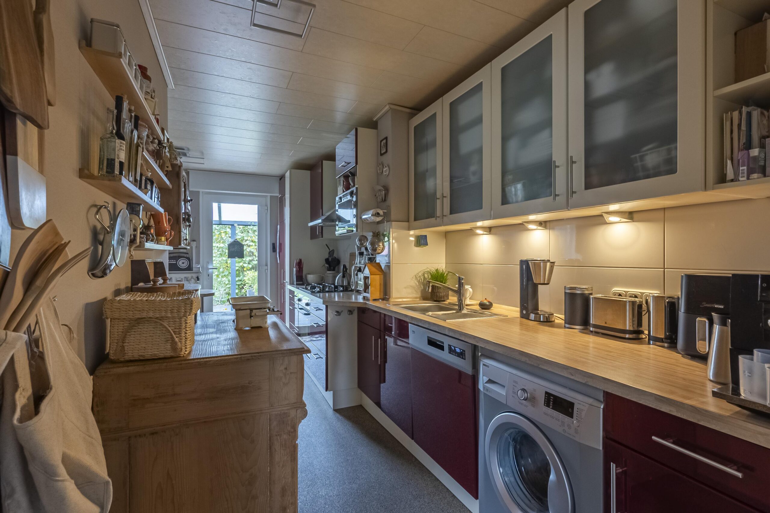 De half open keuken is groot ca. 13 m² en is voorzien van een grindvloer en een rechte keukenopstelling met de navolgende apparatuur: gaskookplaat, afzuigkap, oven, vaatwasser, koel/vrieskast en de wasmachineaansluiting.