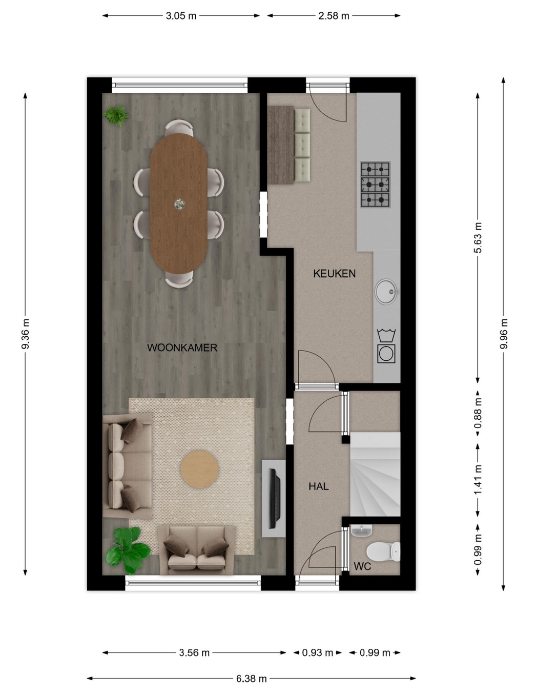 Hal met meterkast, trapopgang en gastentoilet met staand toilet en fonteintje biedt toegang tot zowel de woonkamer als de half open keuken.
