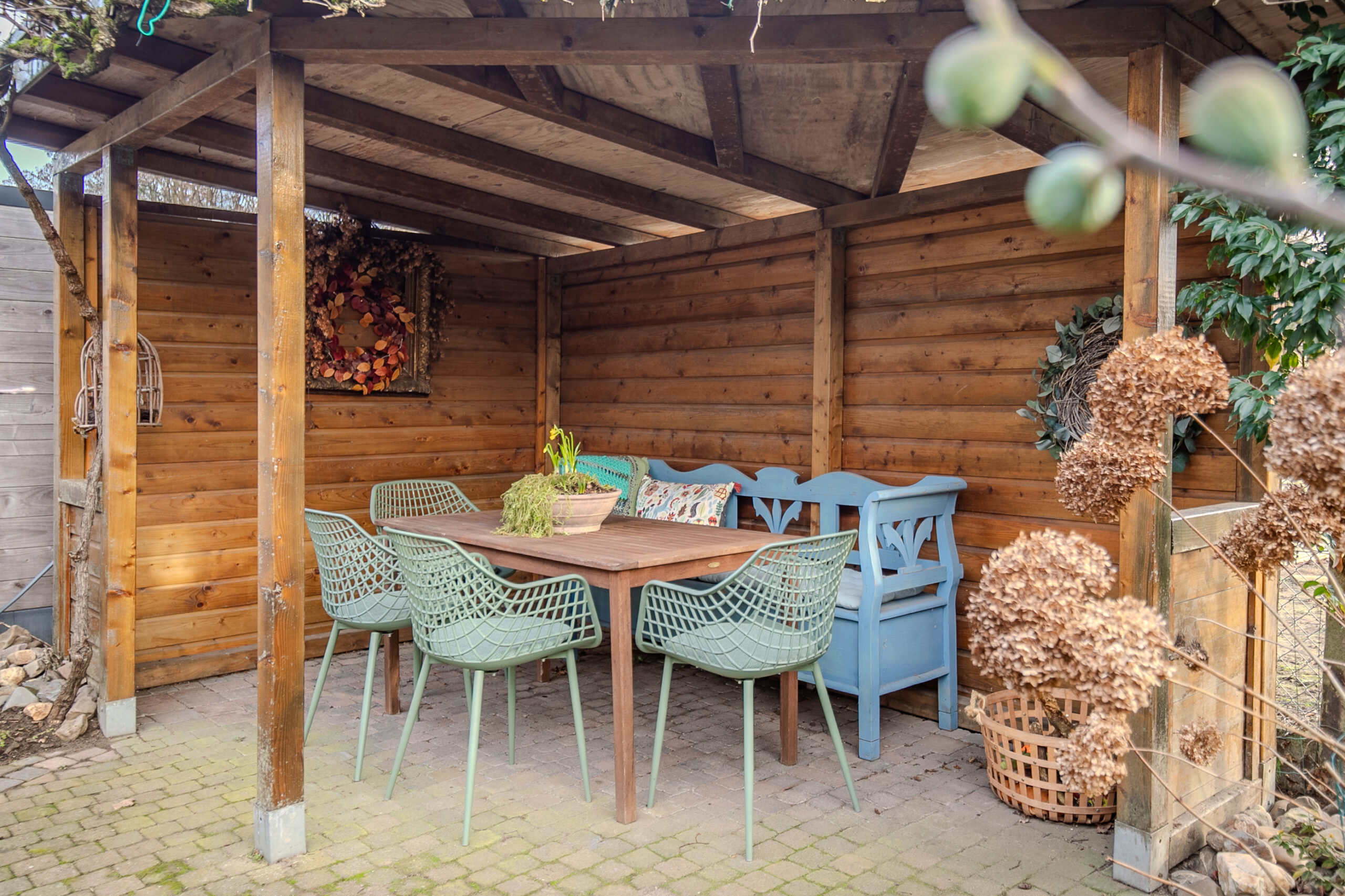 De verzorgde tuin is gelegen op het zuidoosten, waardoor u hier optimaal kunt genieten van de zon. De tuin is netjes aangelegd en beschikt over een groot terras, een houten overkapping achter in de tuin en groene beplanting rondom, wat zorgt voor een fijne en beschutte buitenruimte.