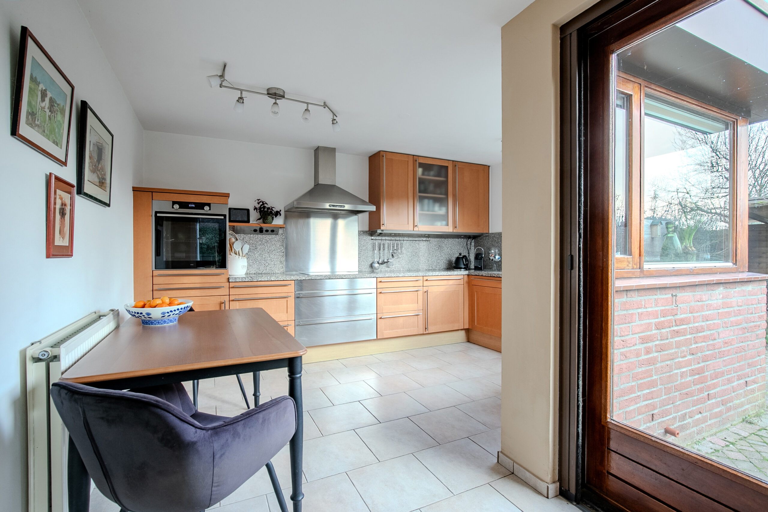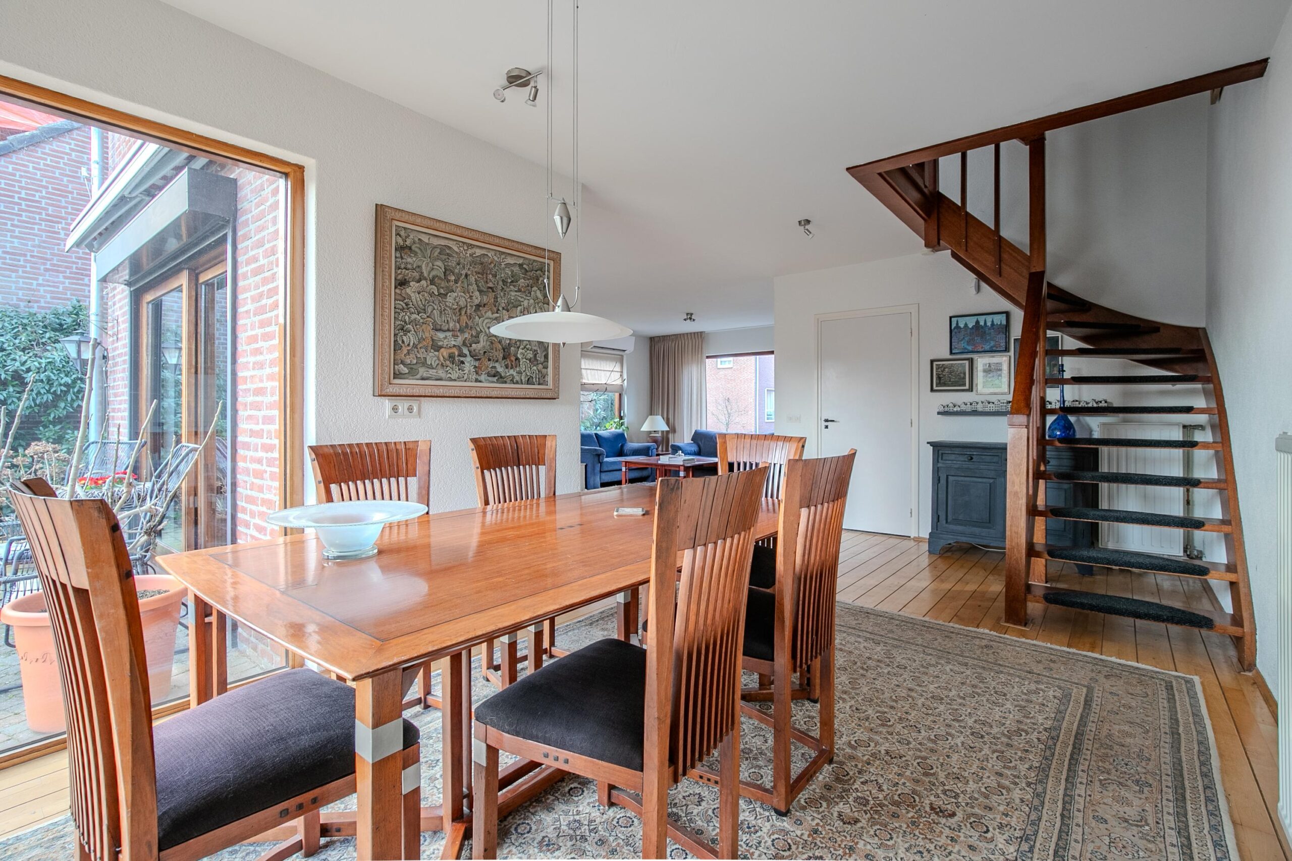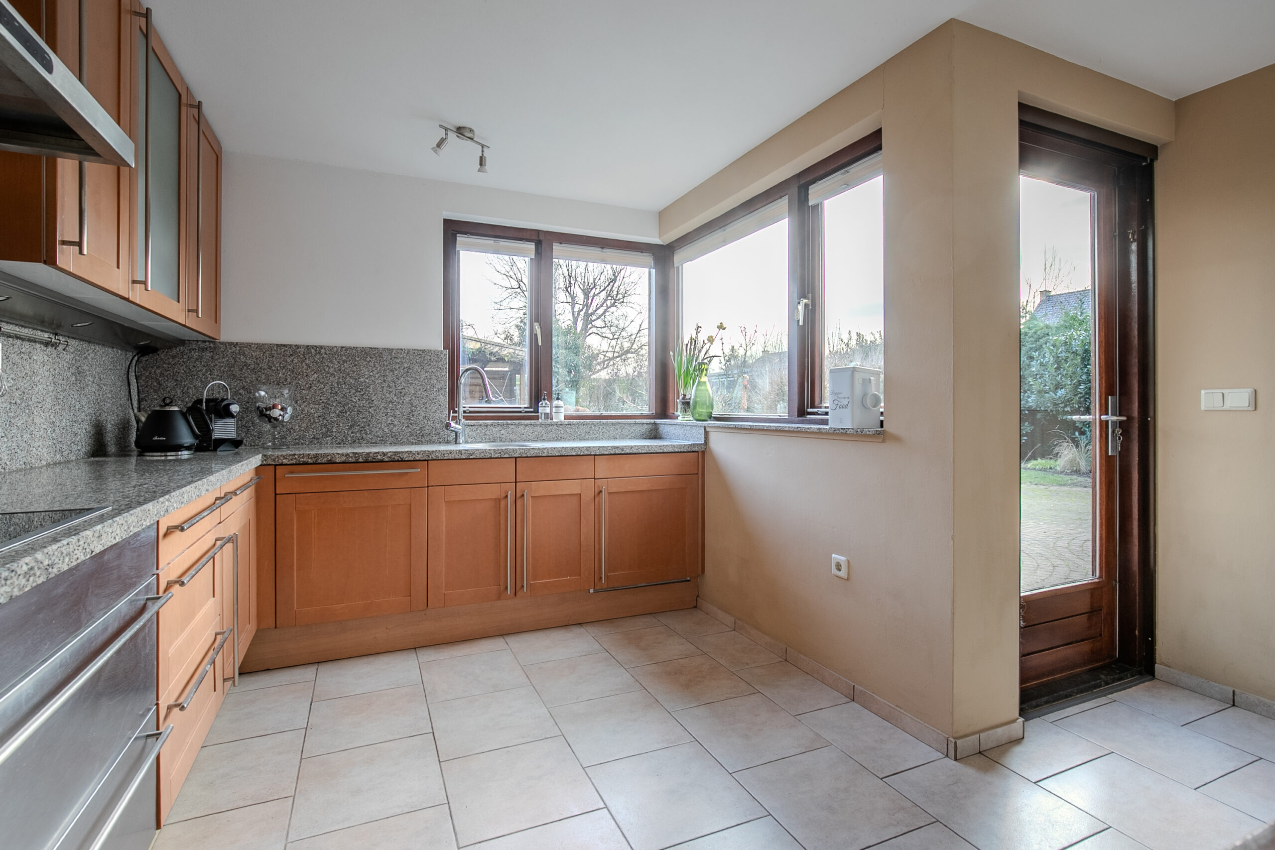In de woonkamer bevindt zich tevens de hardhouten trap naar de eerste verdieping. Aansluitend aan de eetkamer ligt de keuken, voorzien van een lichte tegelvloer en een complete keukenopstelling met grote oven, inductiekookplaat, koelkast, vaatwasser, spoelbak en afzuigkap. Vanuit de keuken heeft u toegang tot zowel de tuin als de garage.