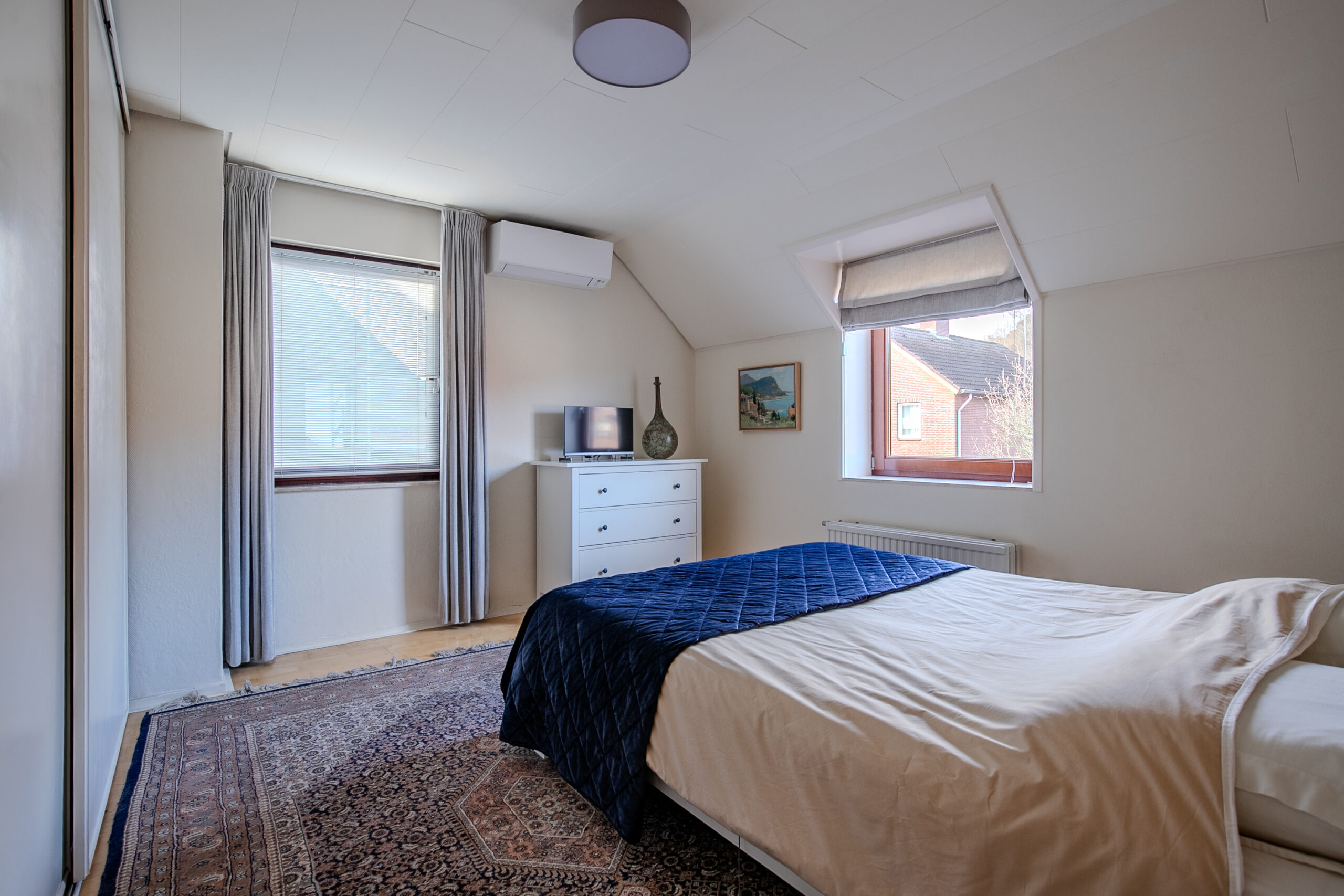 Op de eerste verdieping bevinden zich drie slaapkamers van net tot ruim formaat. Over vrijwel de gehele verdieping ligt een doorlopende laminaatvloer. De ruime badkamer is volledig betegeld en uitgerust met vloerverwarming. Dankzij het dakkapel is de ruimte extra licht en comfortabel. De badkamer is uitgerust met een douche, ligbad, toilet en wastafel.