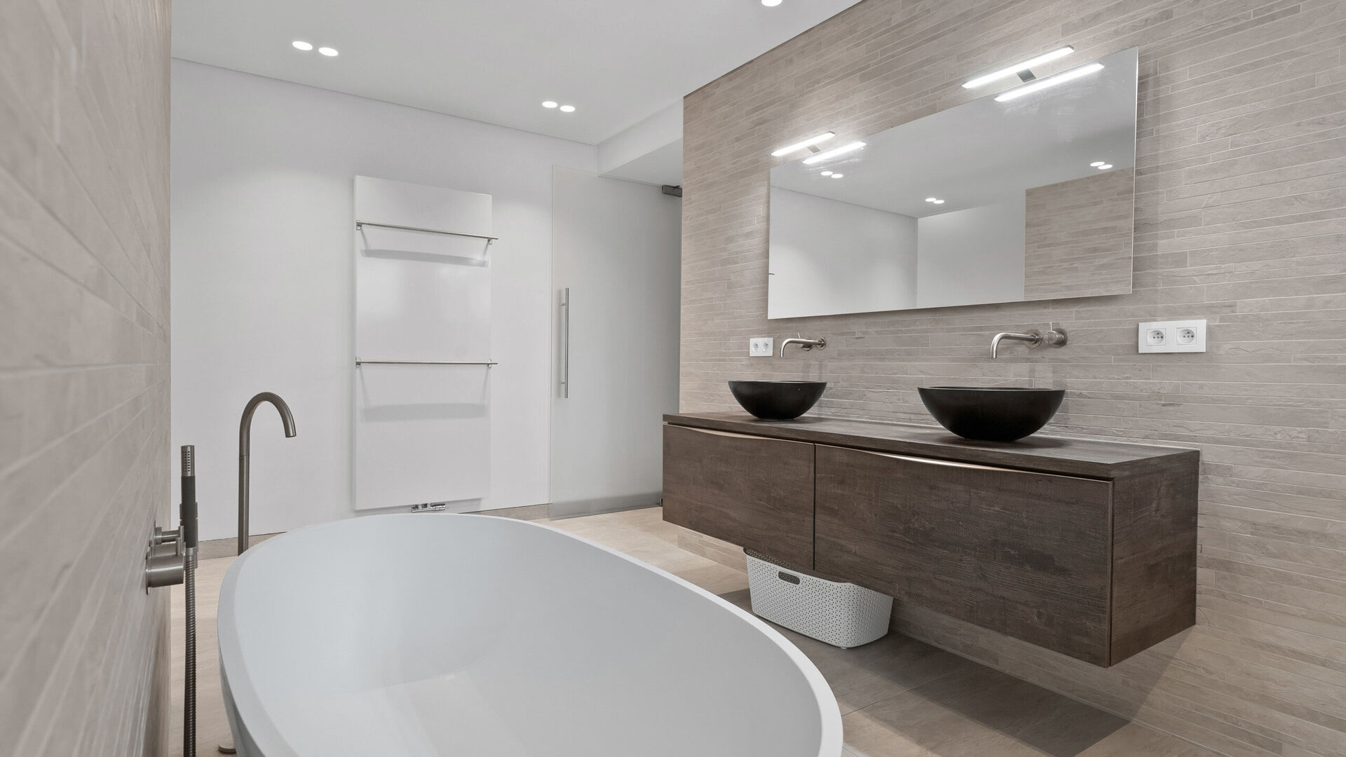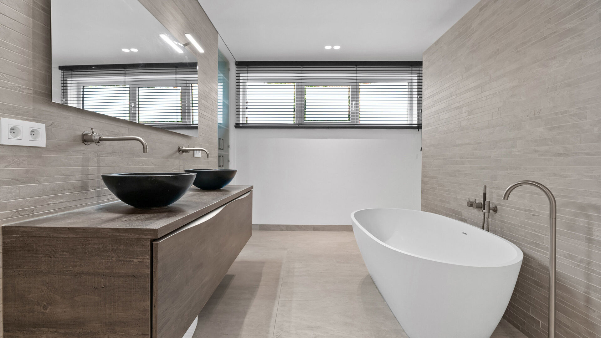 De villa beschikt daarnaast over twee luxueuze badkamers, die het comfort en de verfijning van de woning perfect weerspiegelen. De eerste badkamer is voorzien van een ruime inloopdouche met hoogwaardige afwerking en moderne regendouche, een plek waar u elke dag kunt ontspannen en verfrissen. De tweede badkamer combineert functionaliteit en luxe in één: een weelderig ligbad, ideaal om volledig tot rust te komen, én een separate douche voor een praktische en comfortabele ervaring. Beide badkamers zijn uitgerust met stijlvolle materialen en armaturen, waardoor ze een eigen spa-ervaring in huis bieden en bijdragen aan het ultieme gevoel van welzijn dat deze villa kenmerkt.
